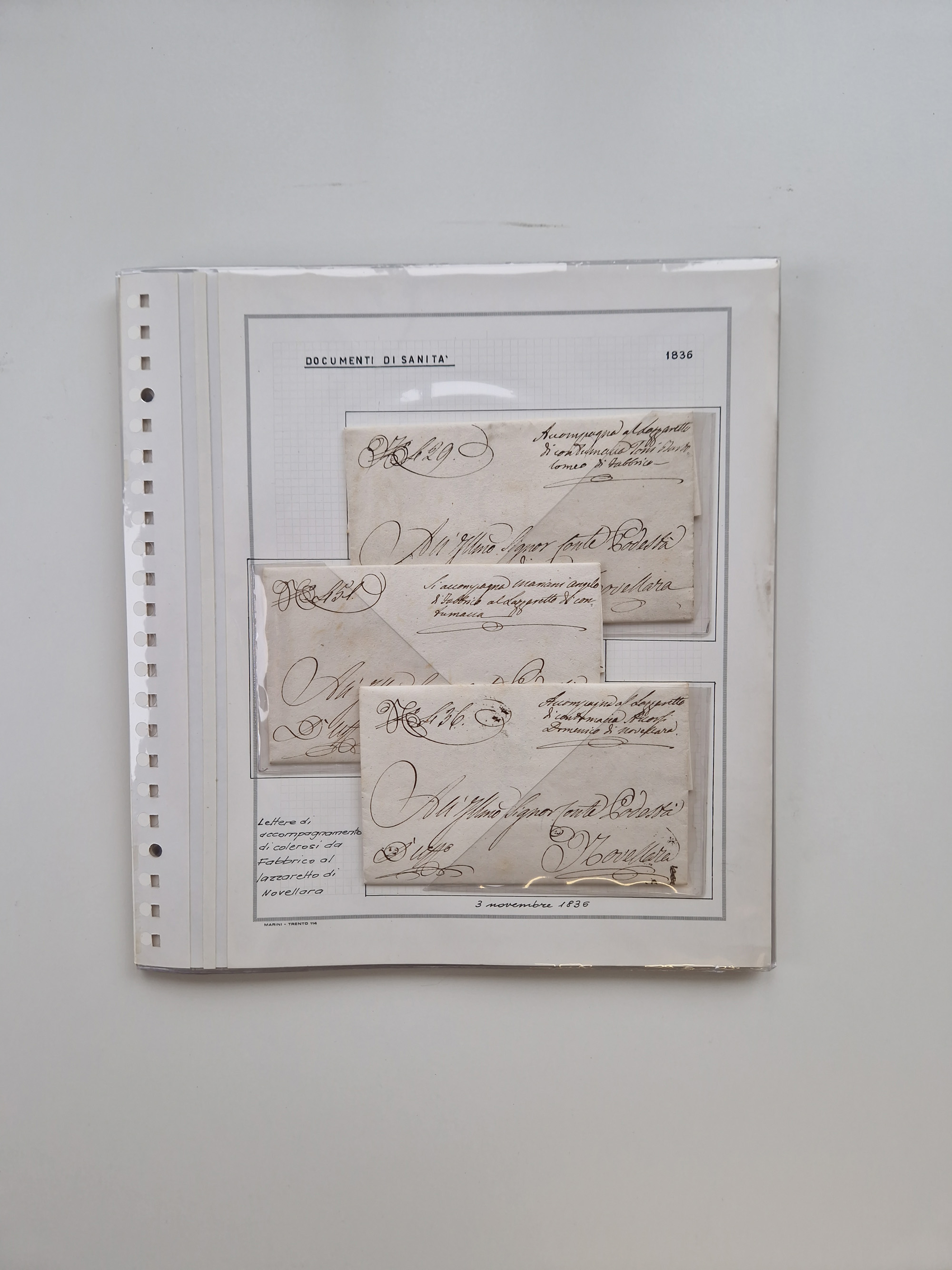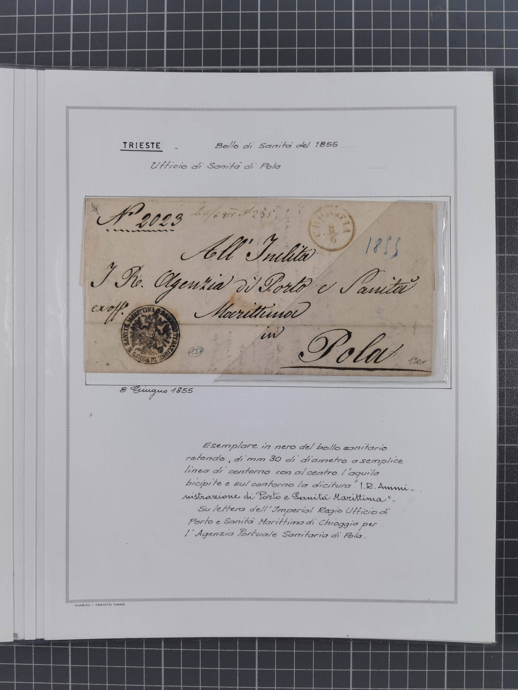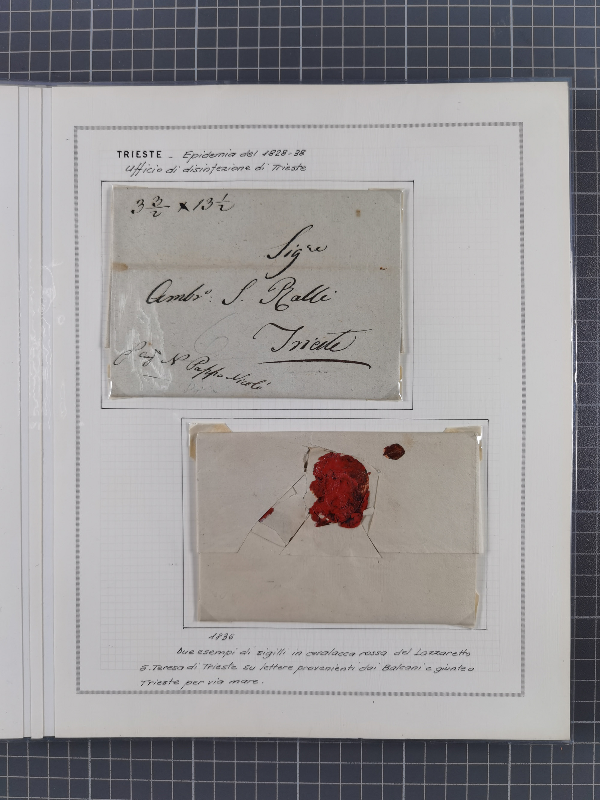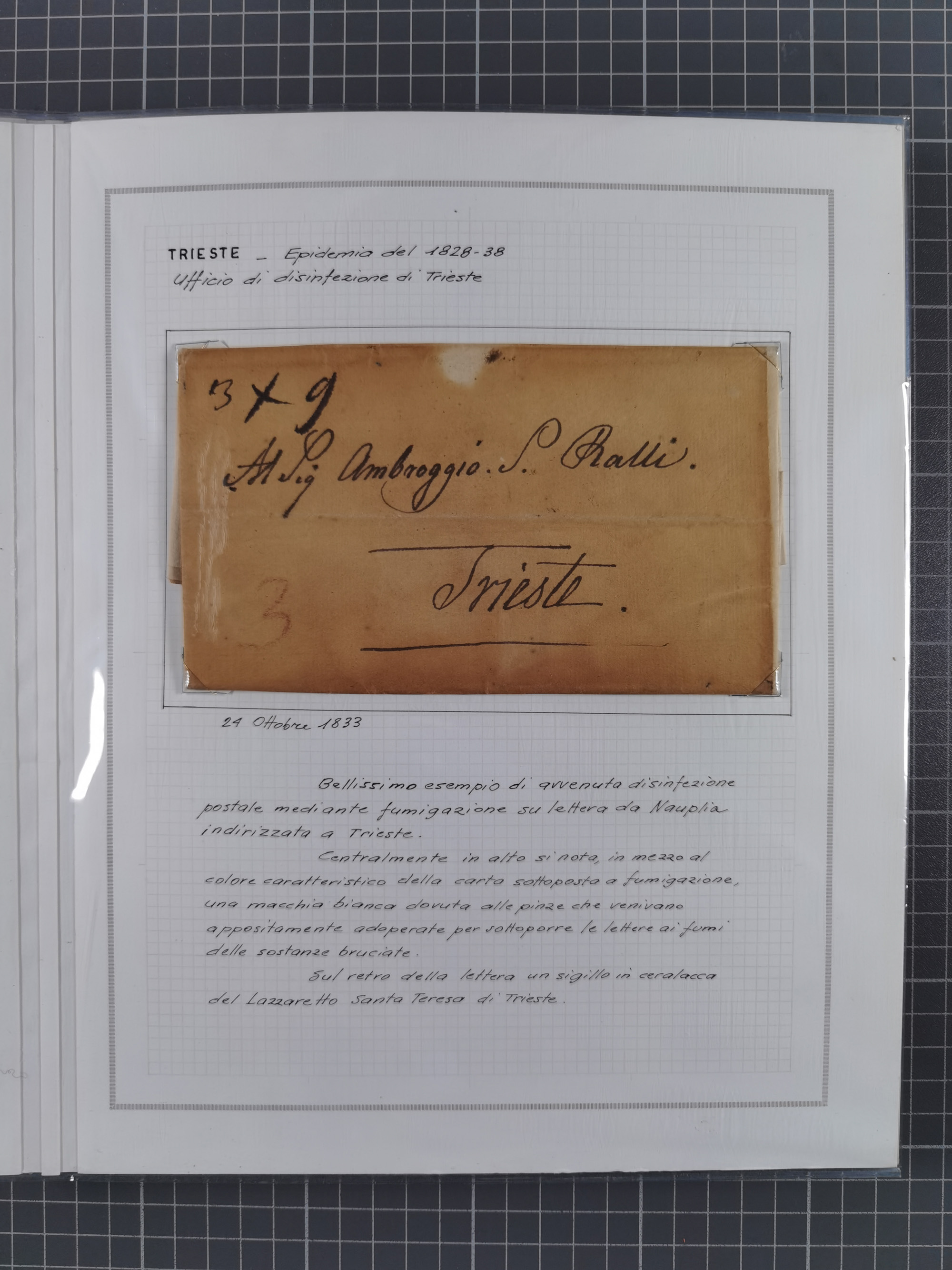 TRIEST: 1814/58, Sammlung mit 26 Briefen und Dokumenten, dabei Sanitätspass (1831) sowie doppelt versiegelter Desinfektionsbrief von Alexandria nach Triest (1858), sauber beschrieben im Album