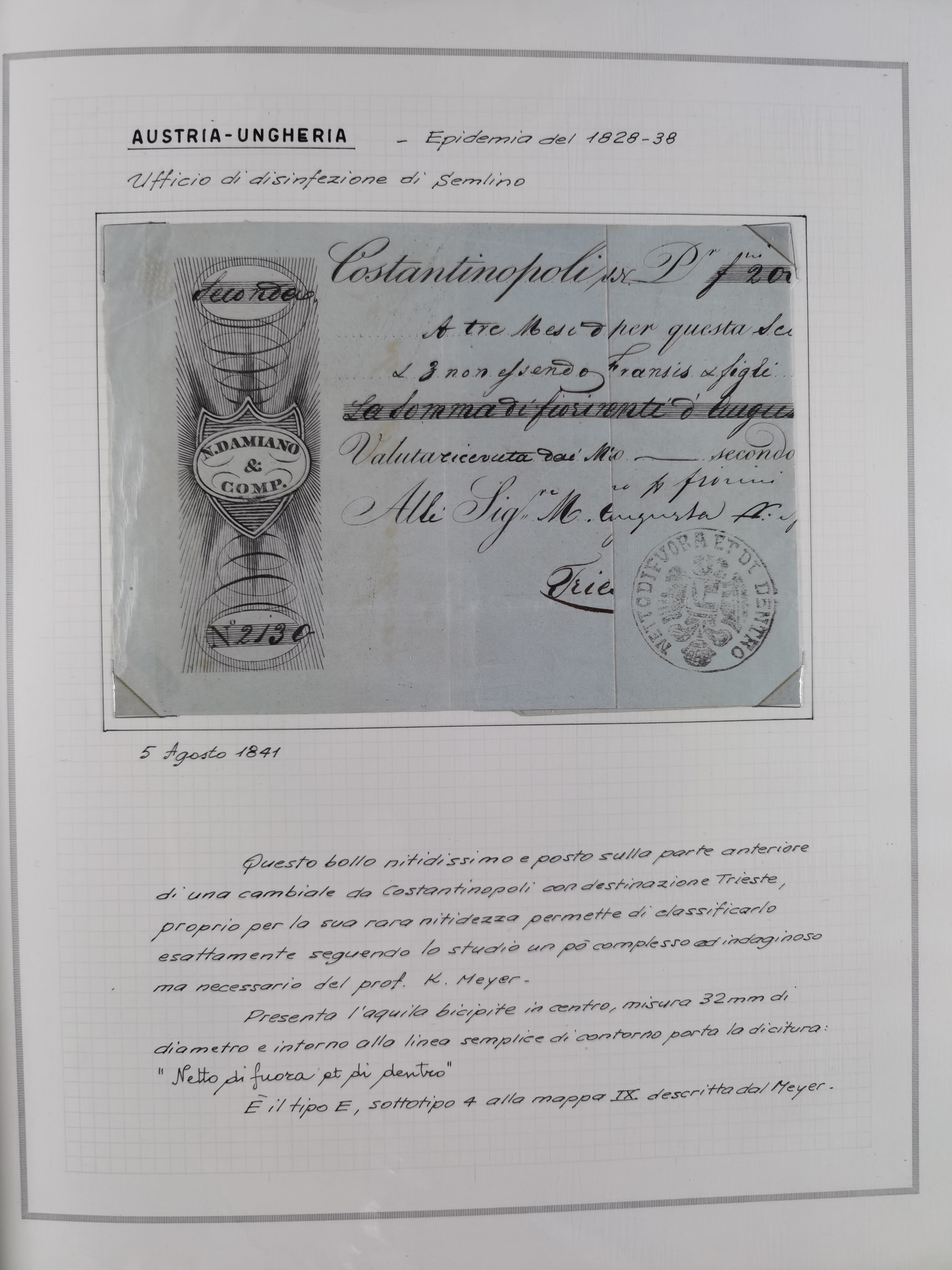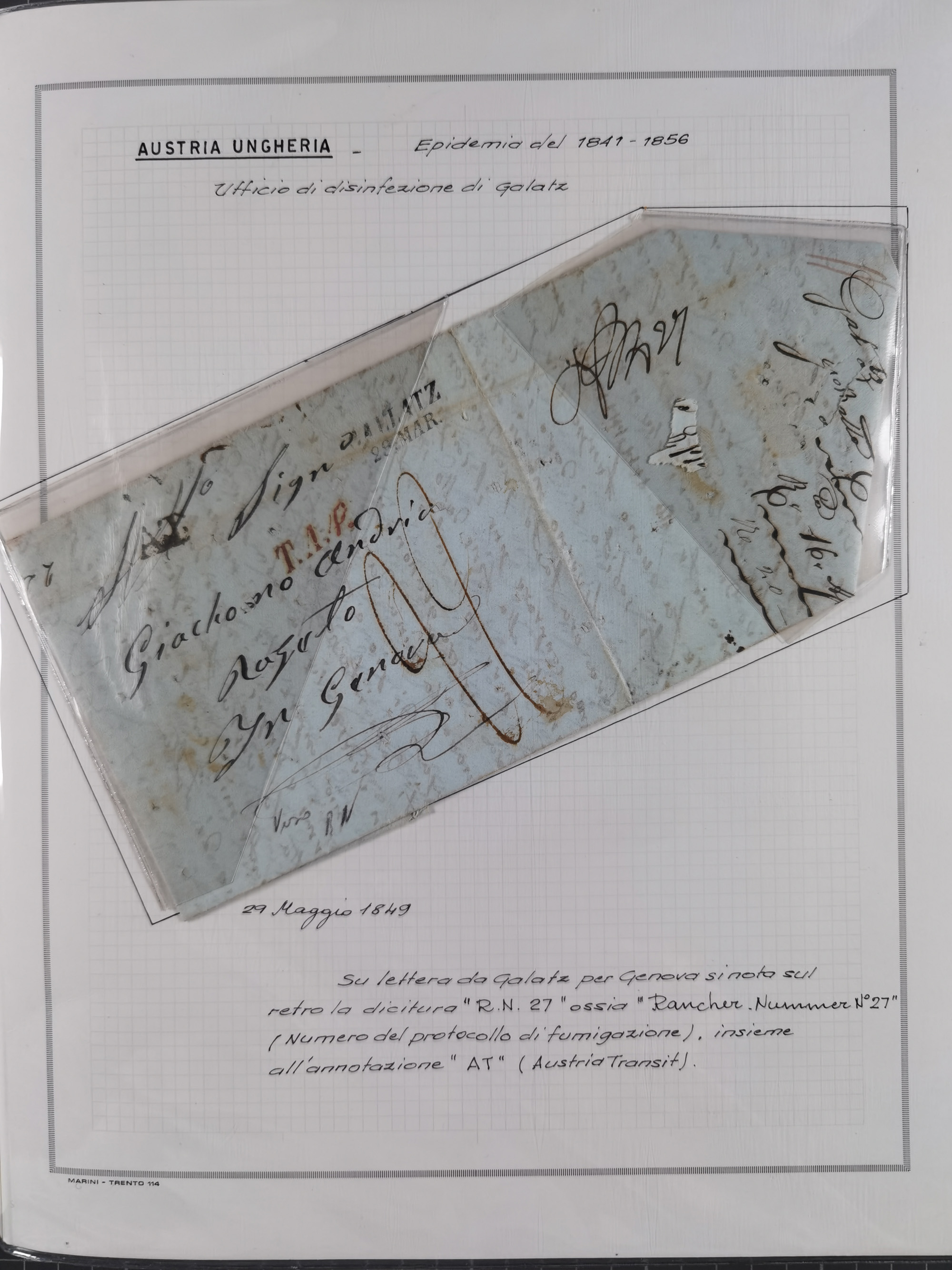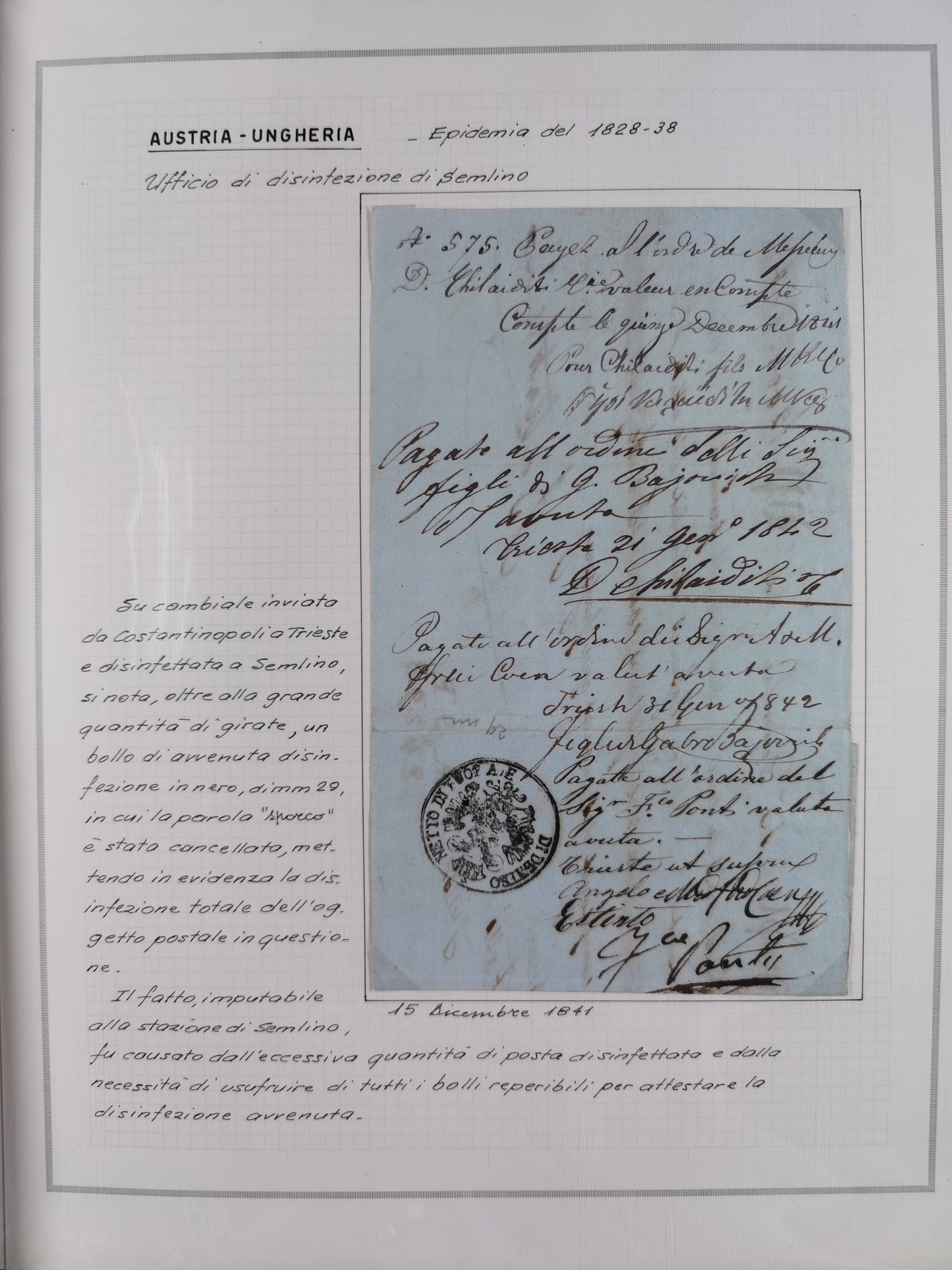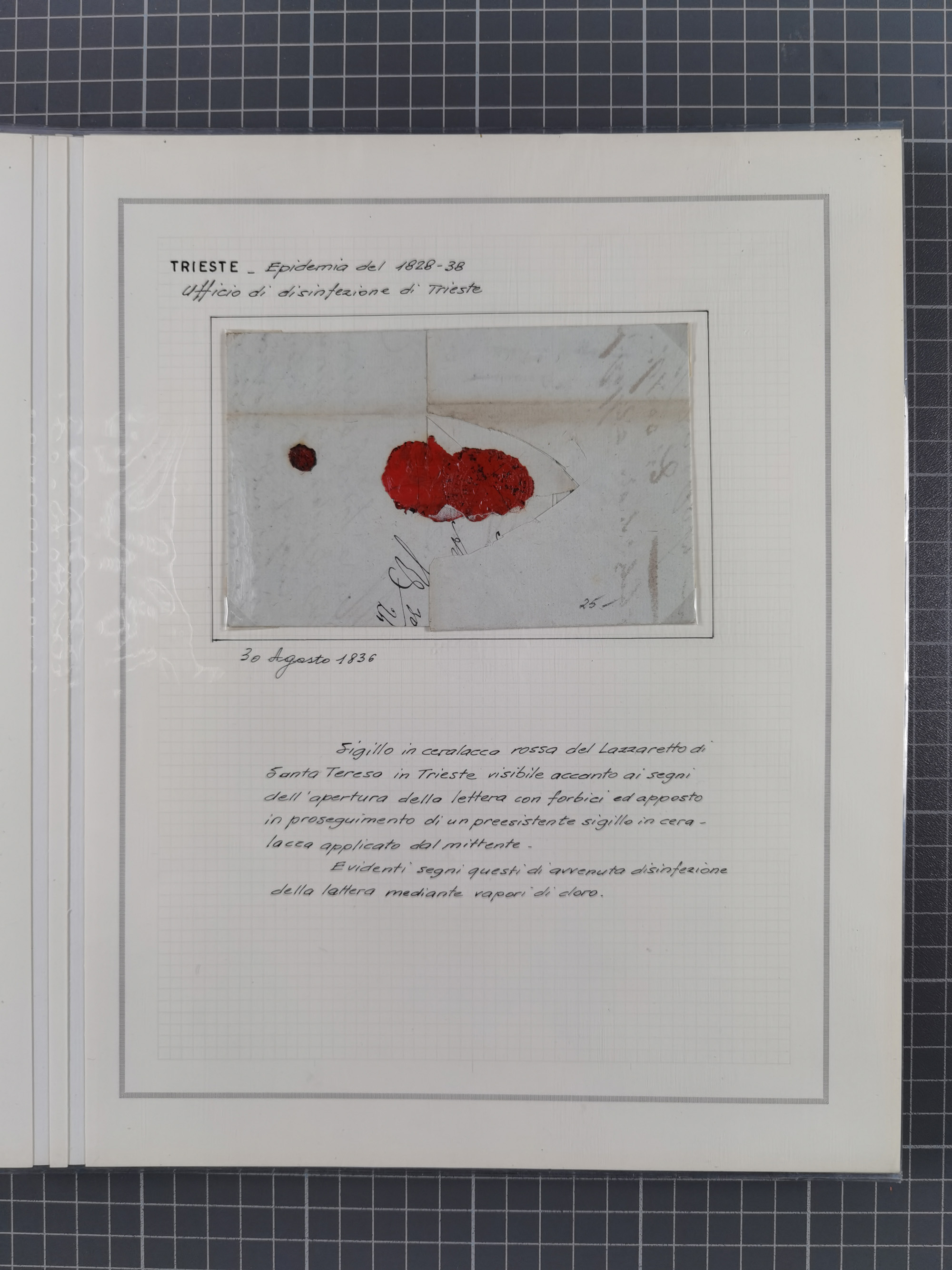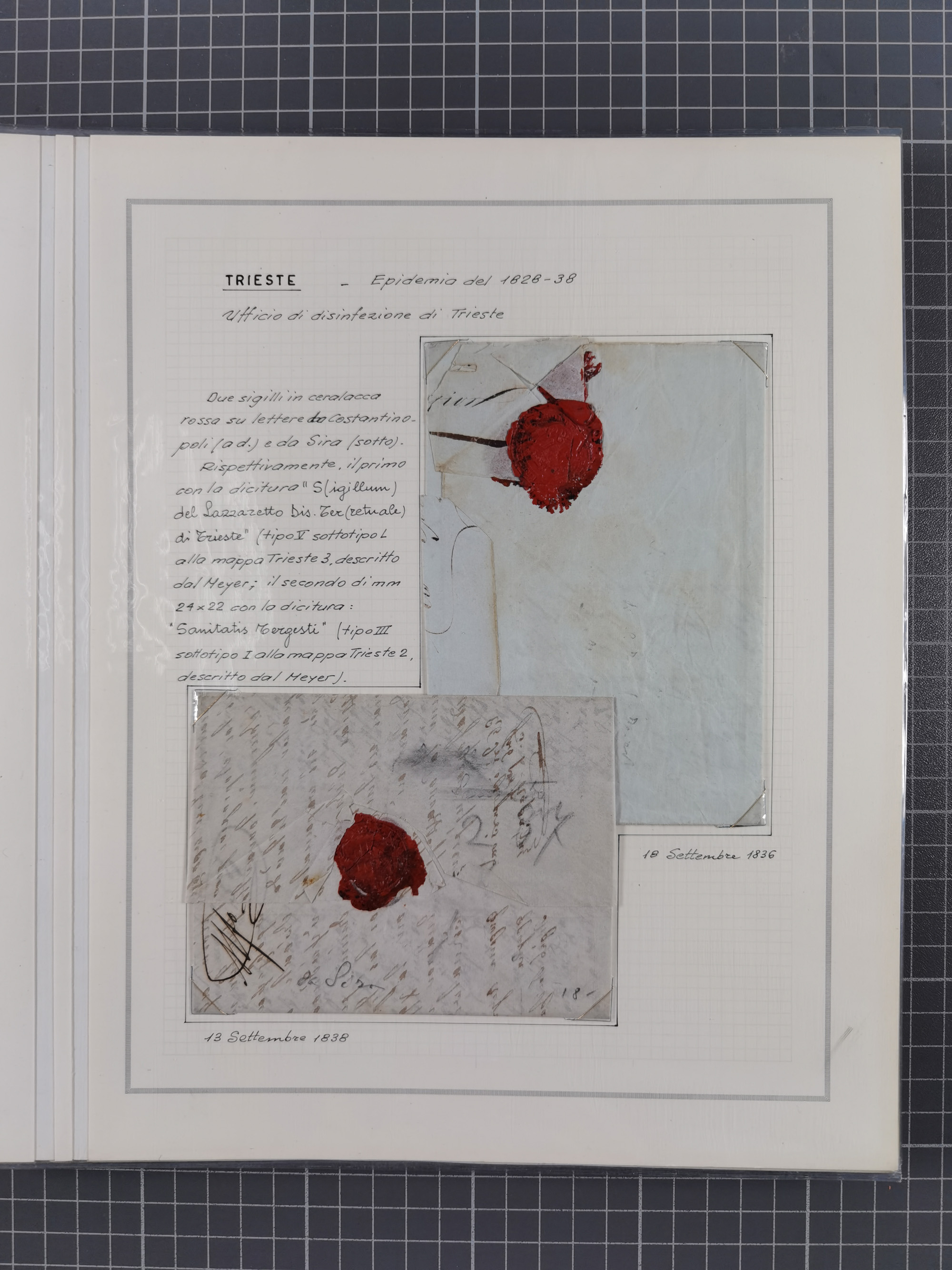 TRIEST: 1814/58, Sammlung mit 26 Briefen und Dokumenten, dabei Sanitätspass (1831) sowie doppelt versiegelter Desinfektionsbrief von Alexandria nach Triest (1858), sauber beschrieben im Album