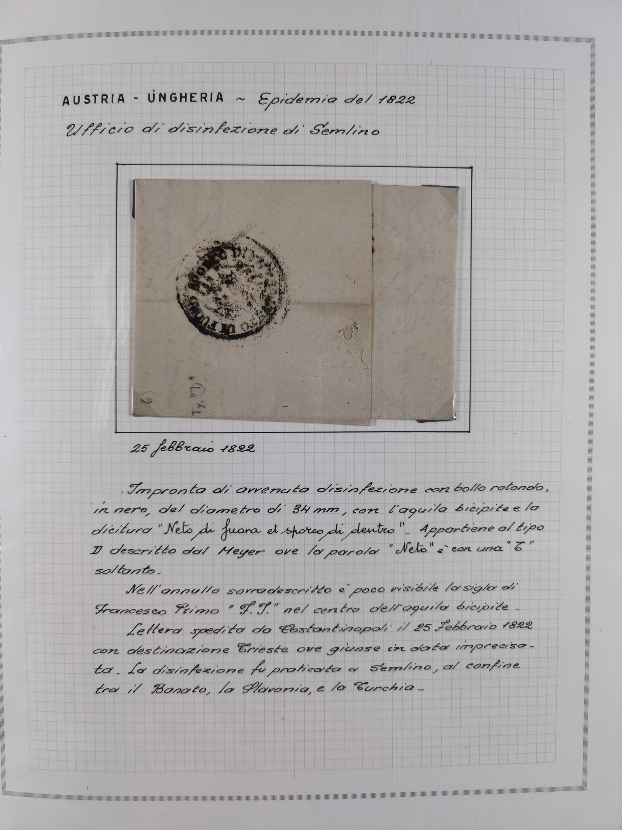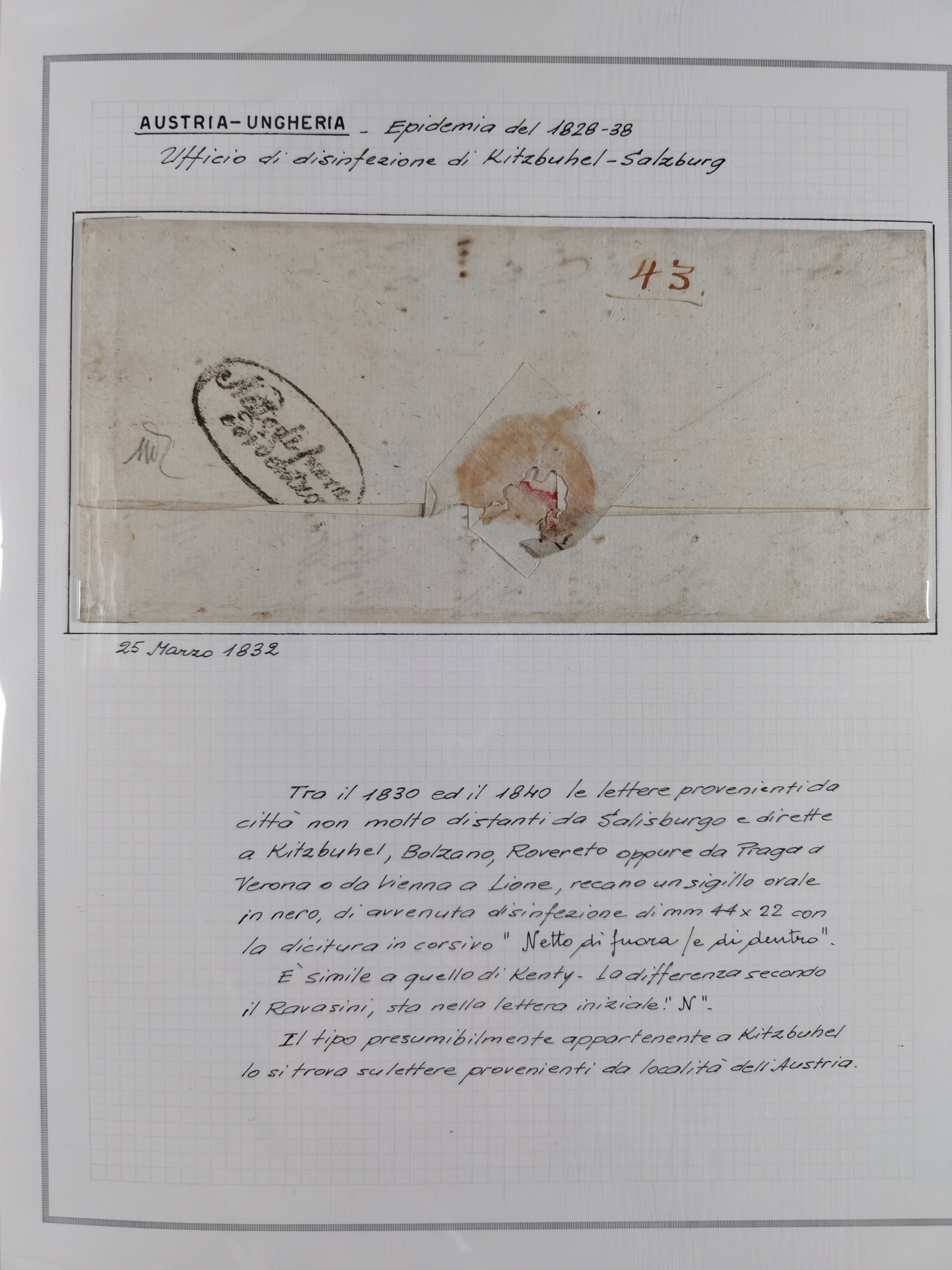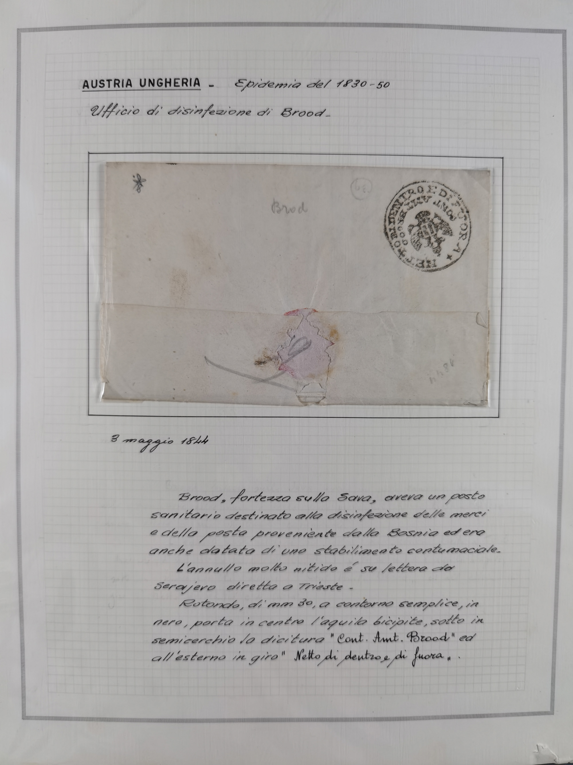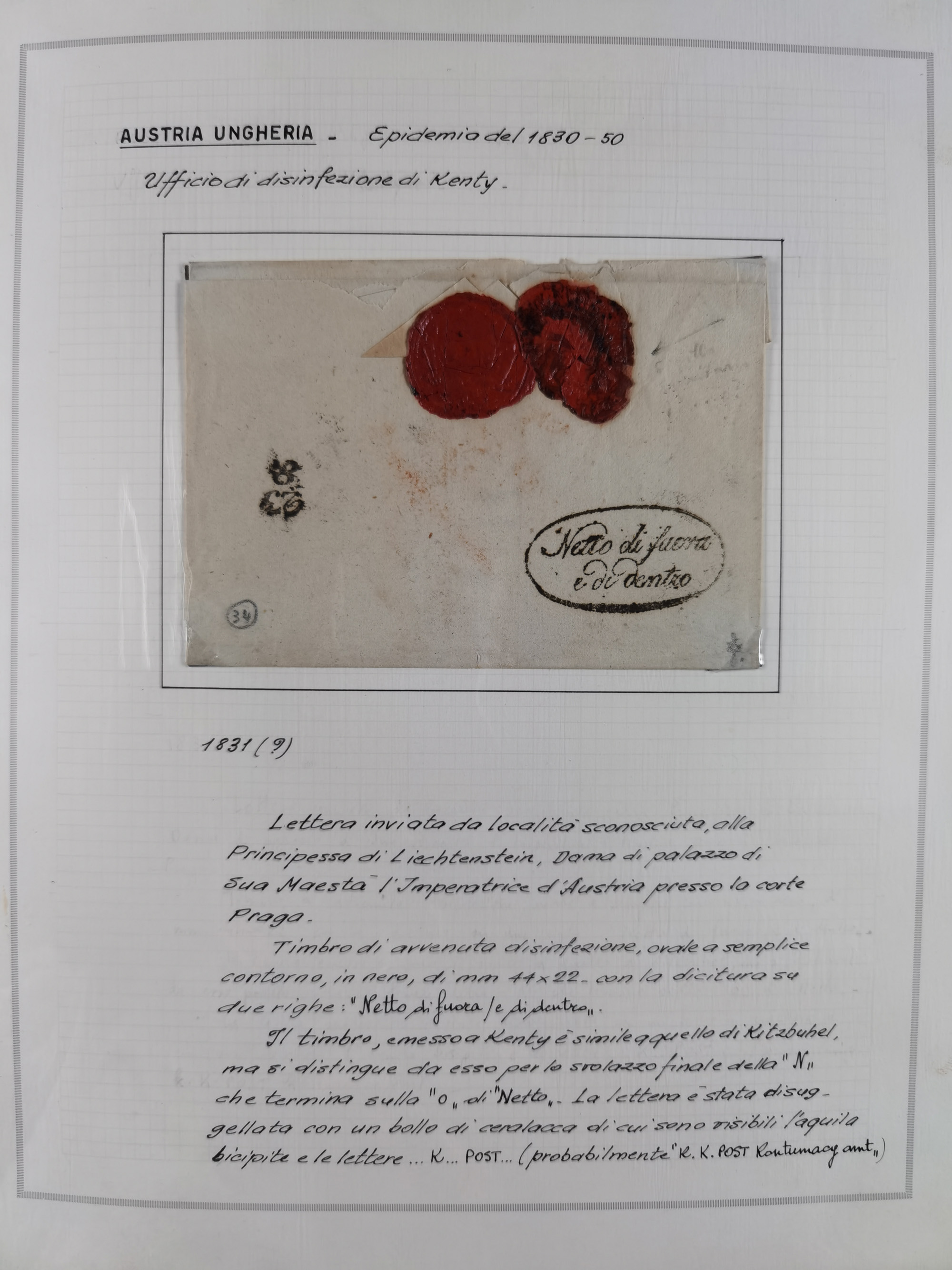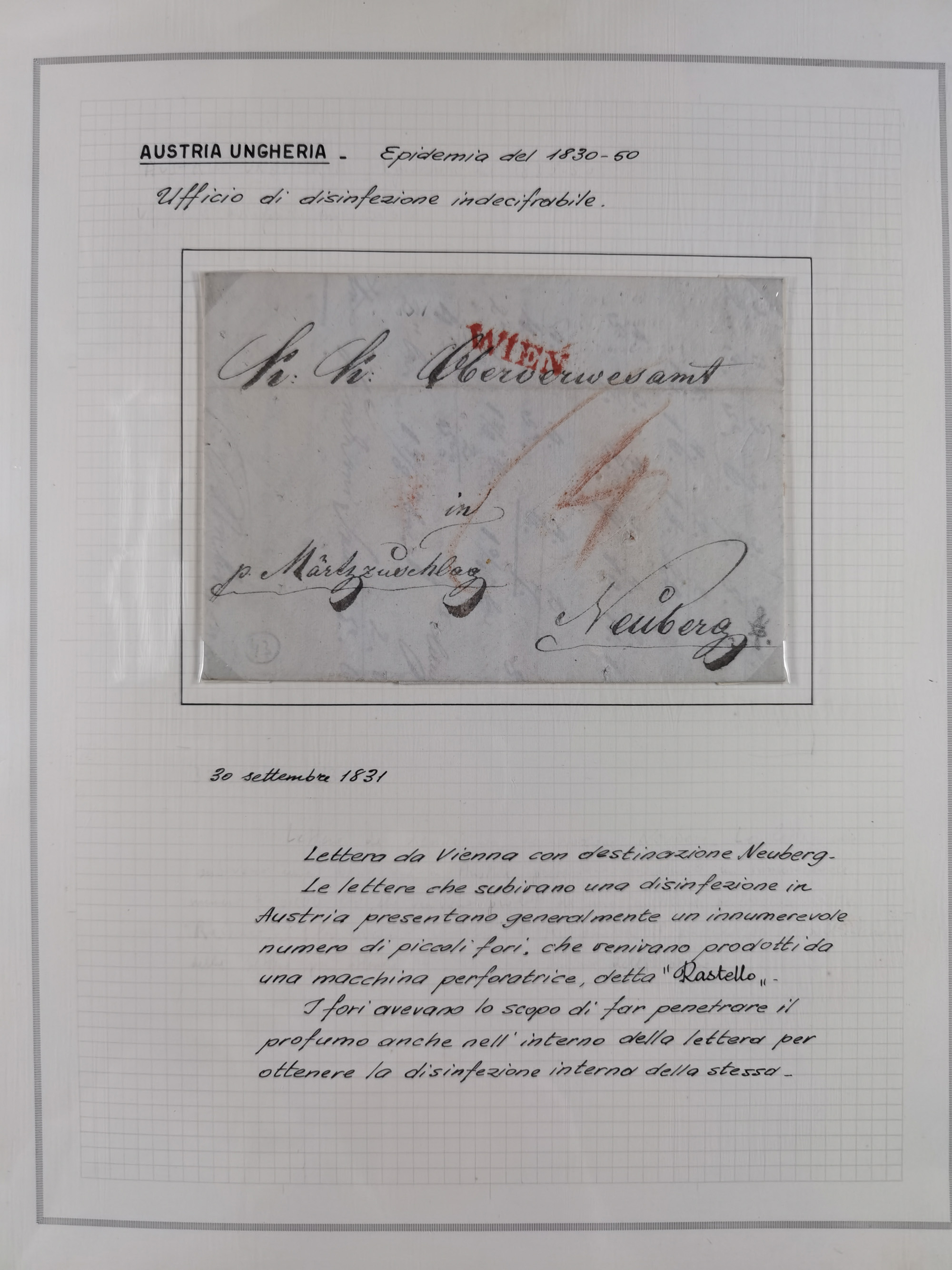ÖSTERREICH-UNGARN: 1806/1918, über 70 Briefe und Dokumente, meist Desinfektions-Post mit Schwerpunkt von 1806 bis 1866, dabei Brief (ca. 1831) an die Prinzessin von Liechtenstein (zum Hof nach Prag). Später etwas I. Weltkrieg, sehr interessant, sauber beschrieben in zwei Alben