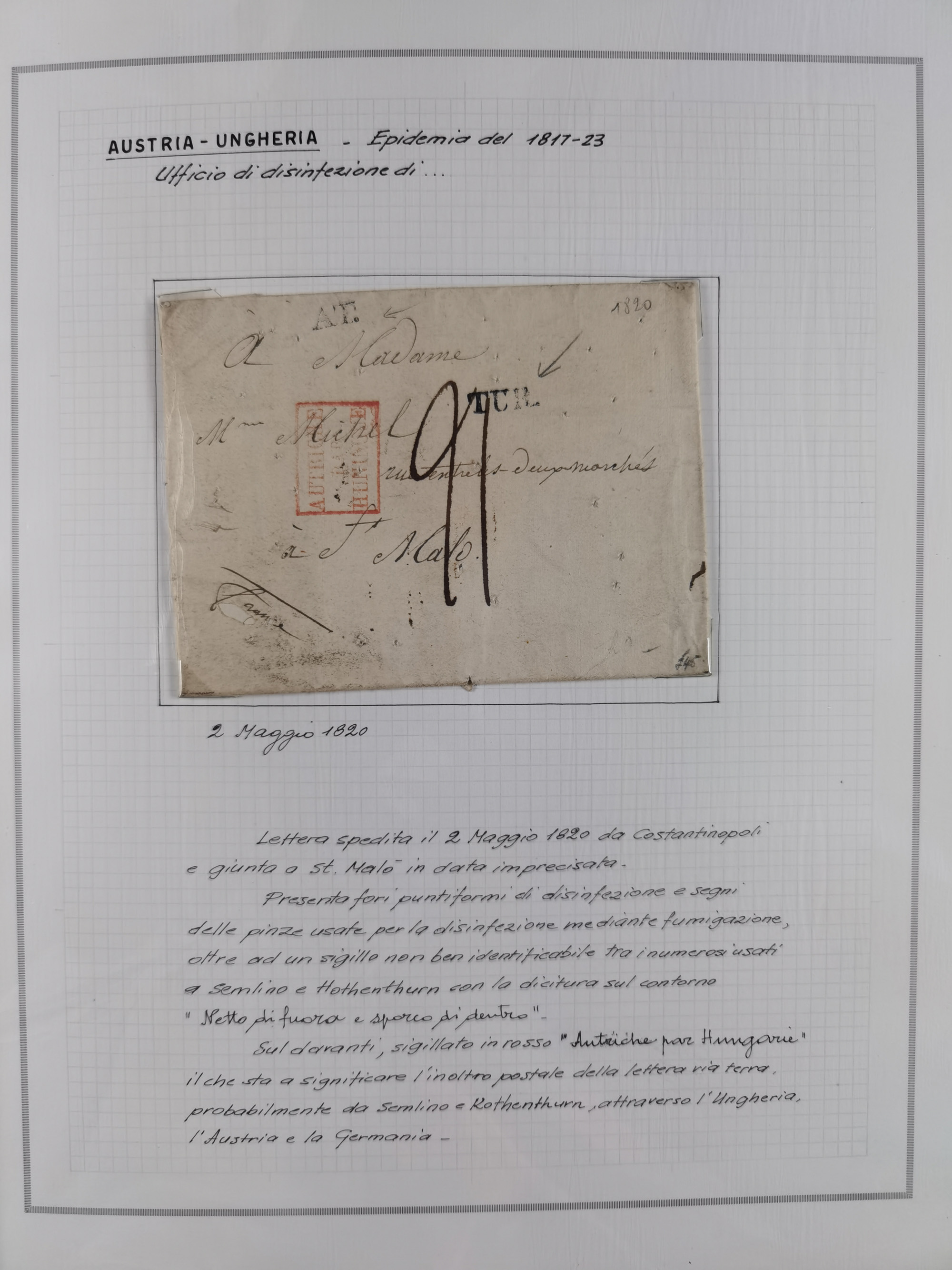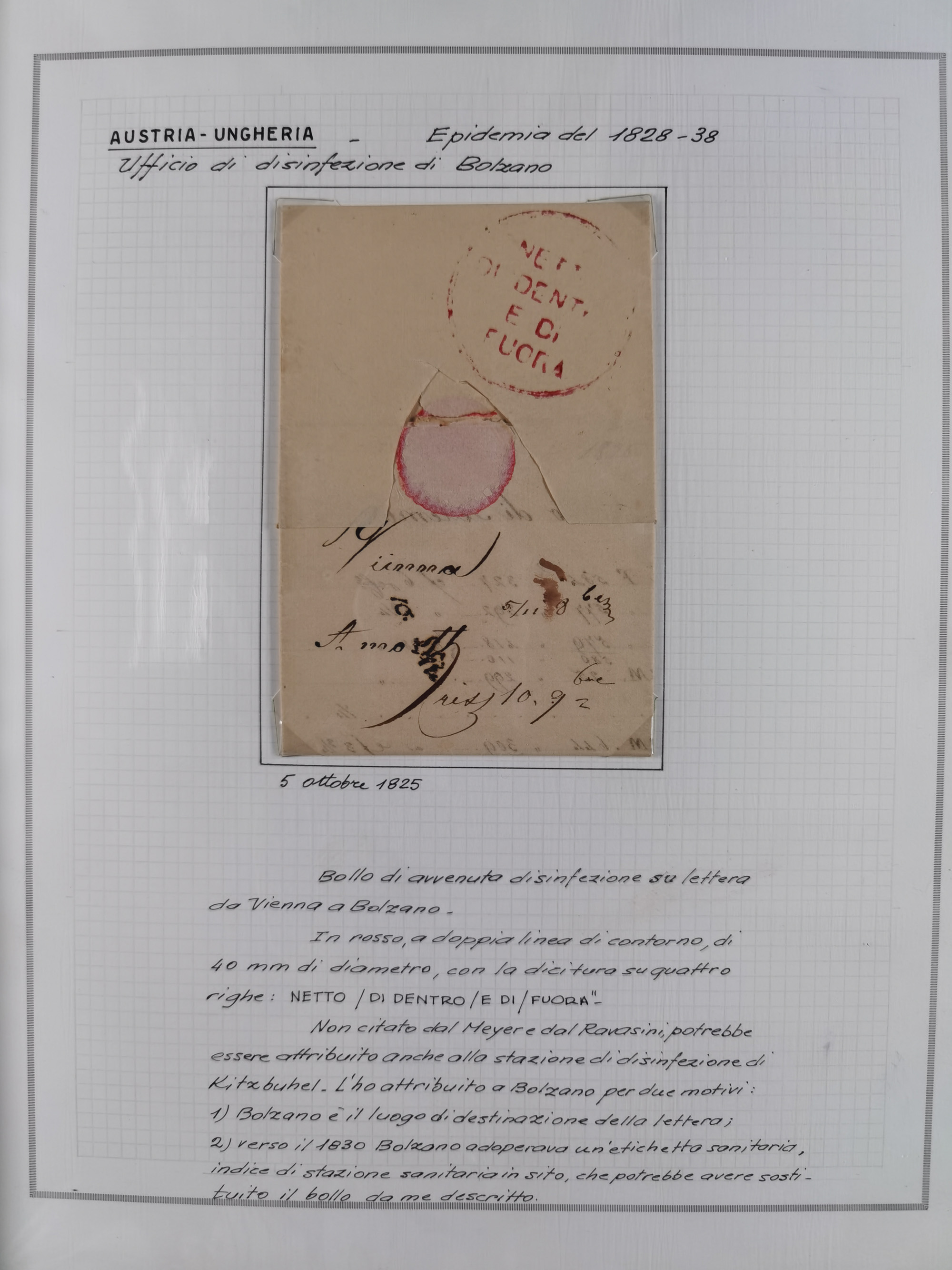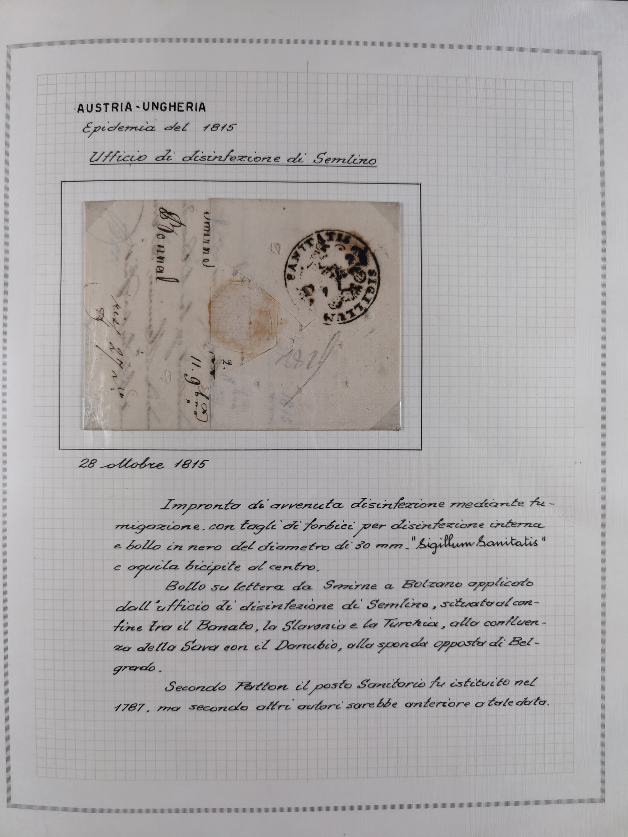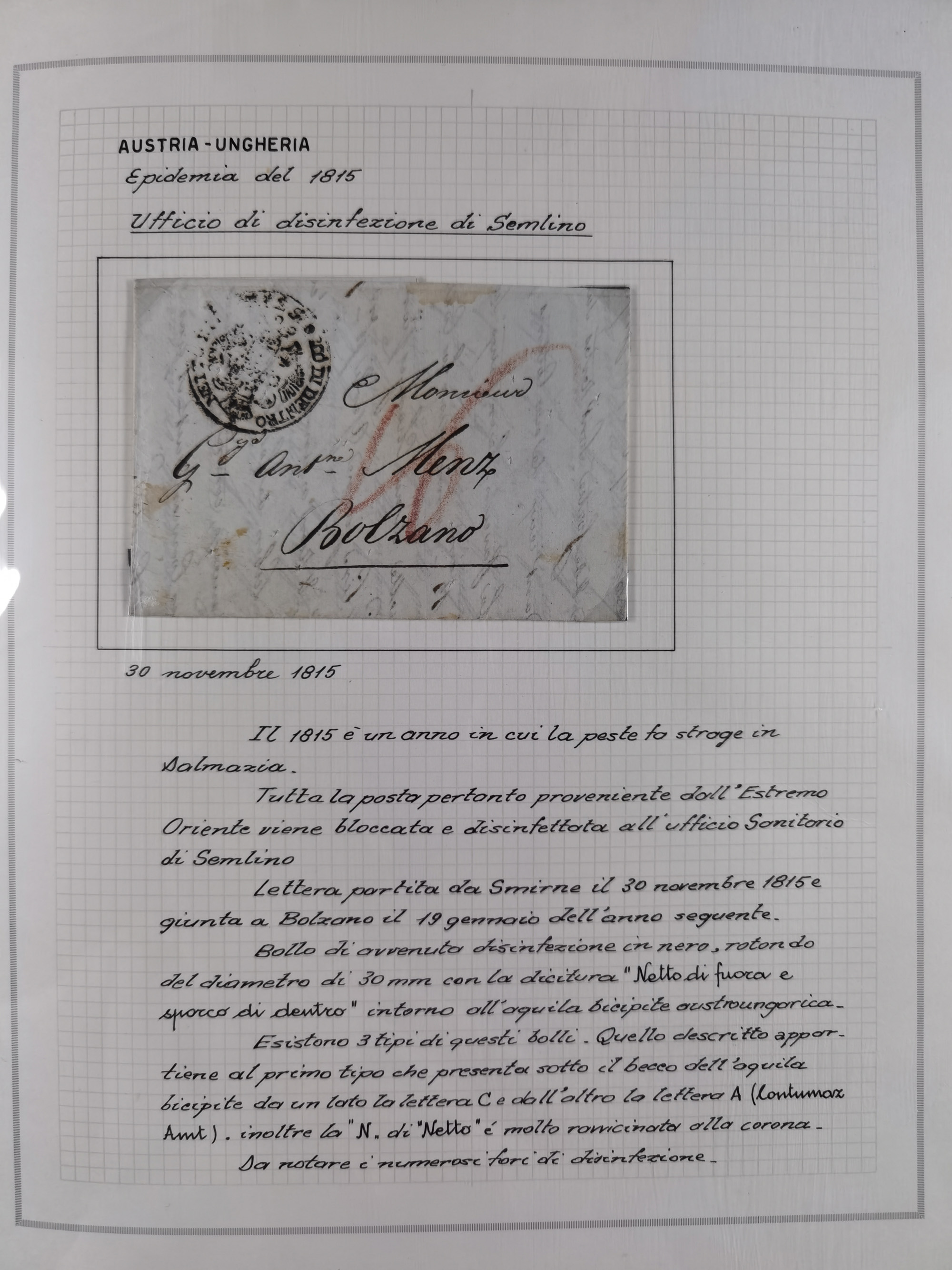 ÖSTERREICH-UNGARN: 1806/1918, über 70 Briefe und Dokumente, meist Desinfektions-Post mit Schwerpunkt von 1806 bis 1866, dabei Brief (ca. 1831) an die Prinzessin von Liechtenstein (zum Hof nach Prag). Später etwas I. Weltkrieg, sehr interessant, sauber beschrieben in zwei Alben