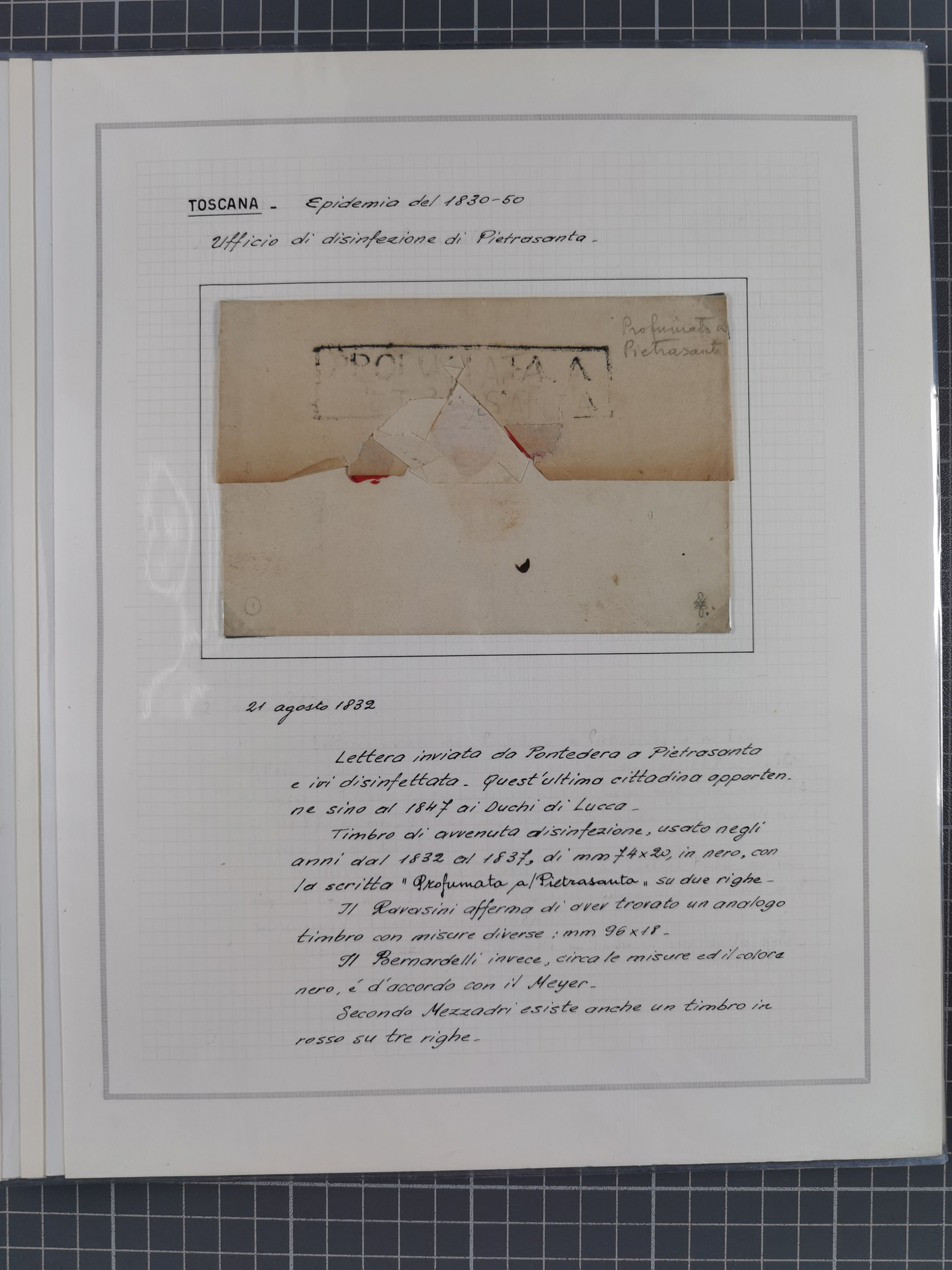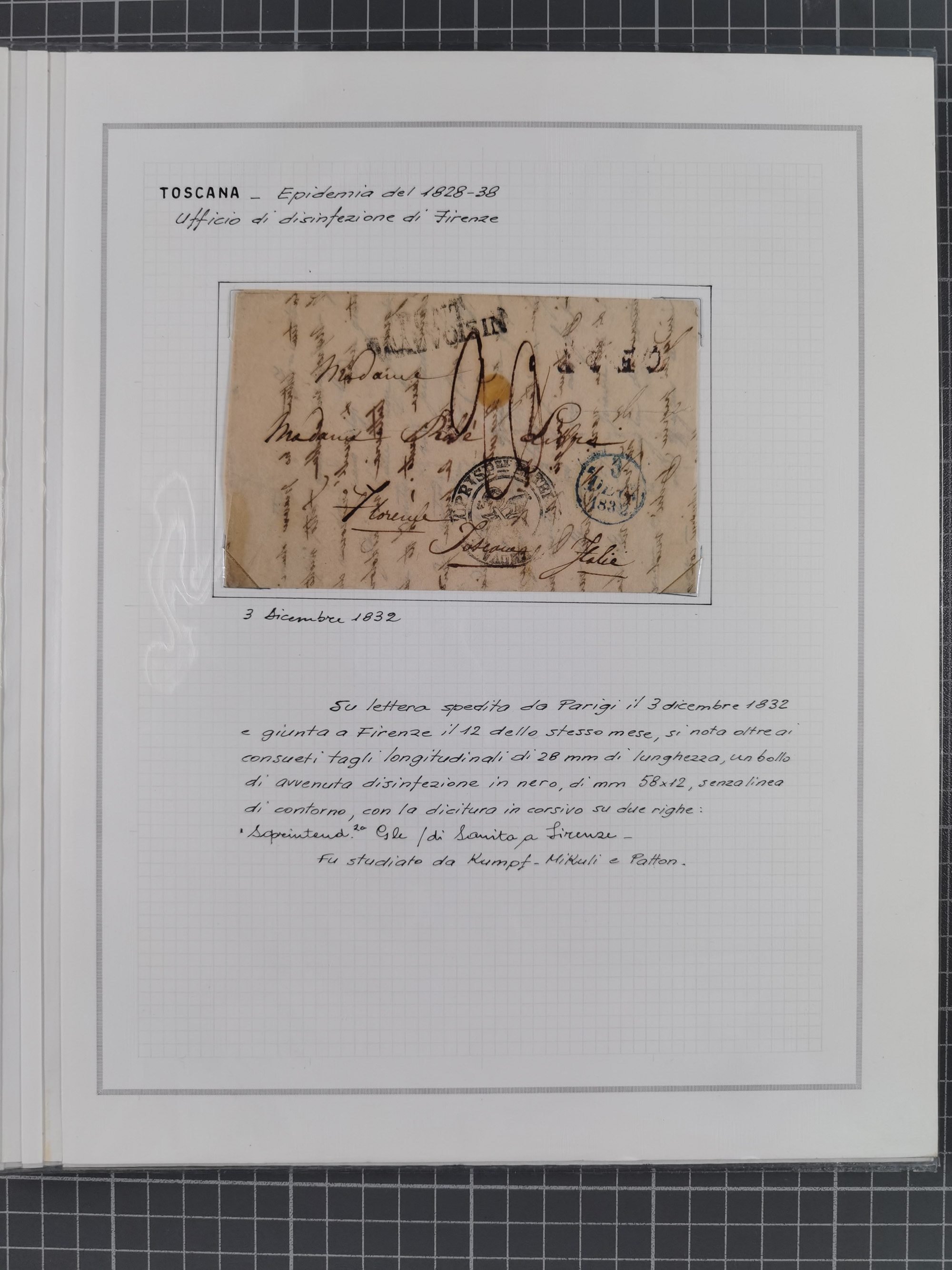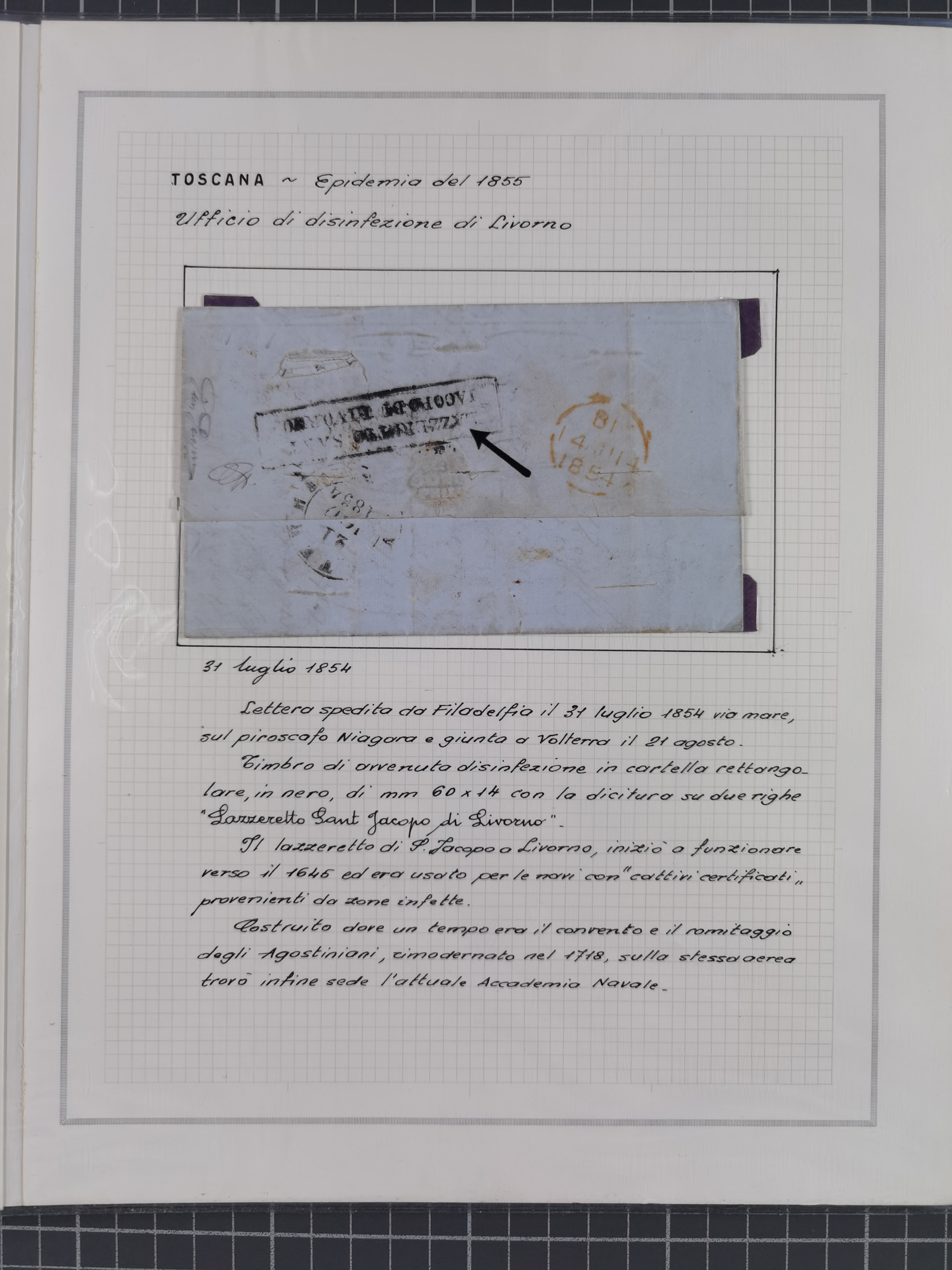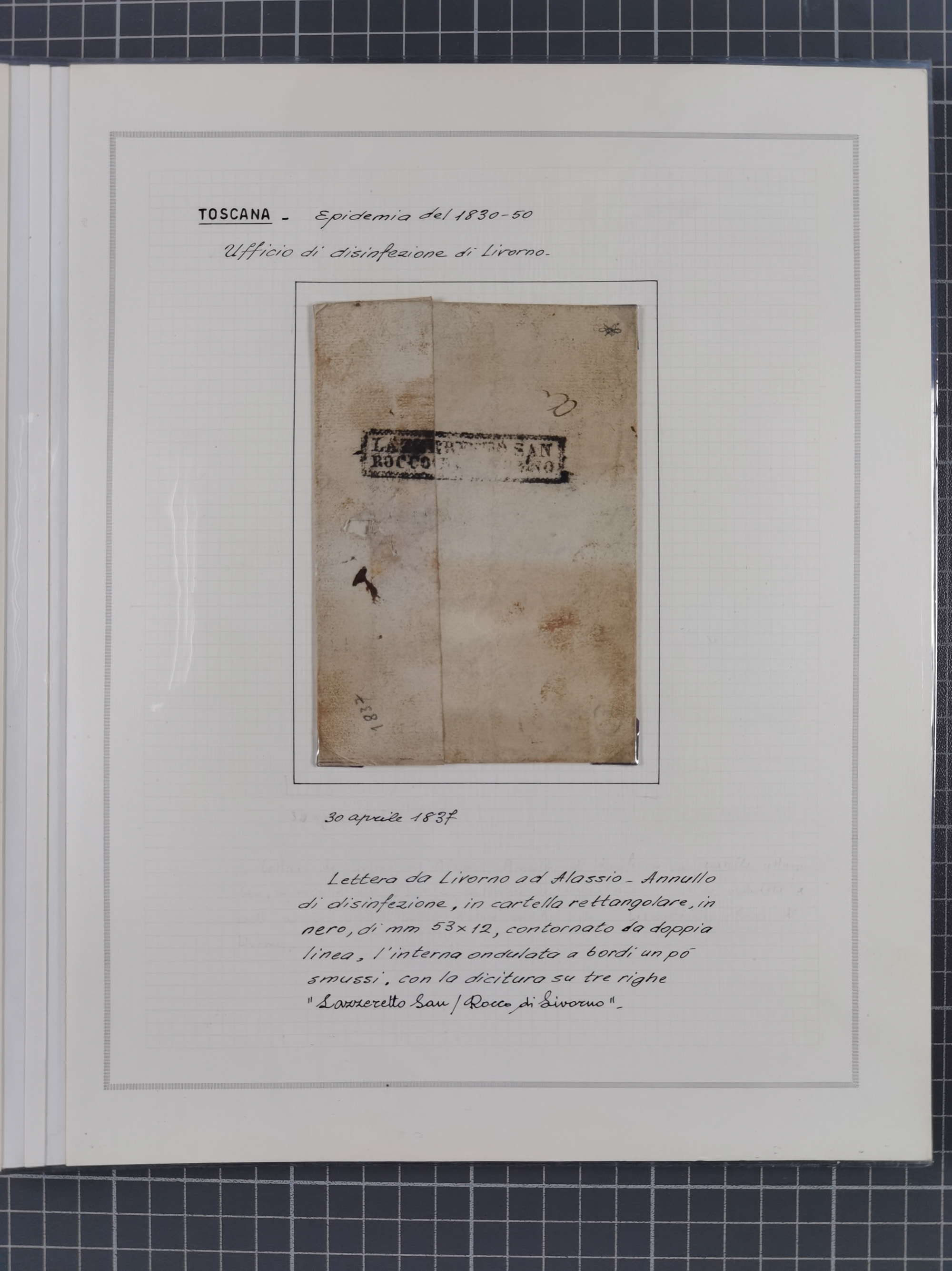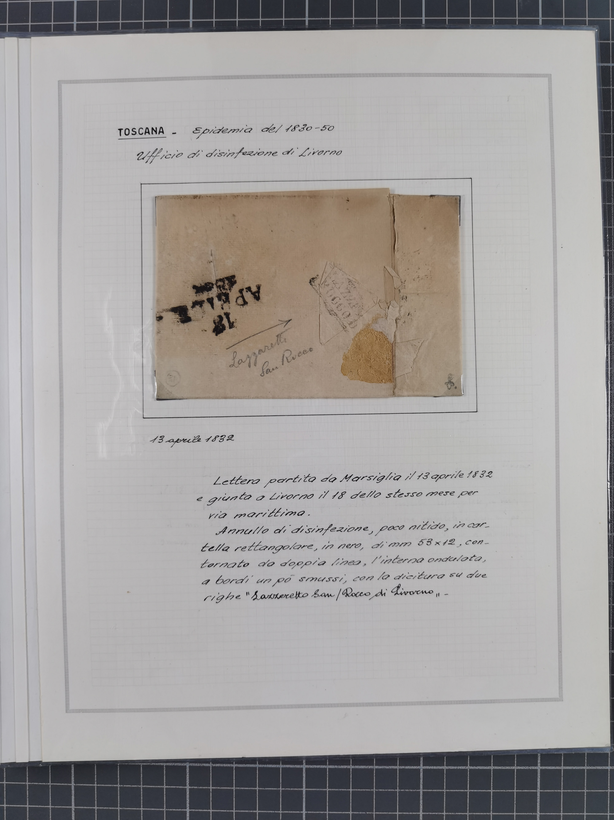 TOSKANA: 1803/1893, 17 Briefe und Dokumente aus dem 19. Jahrhundert inkl. Ra2 "LAZZERETTO SAN / ROCCO DI LIVORNO” der Quarantänestation, Incoming Mail aus Frankreich 1832 + 1884 und aus den USA per Steamer 1855, sauber beschrieben im Album