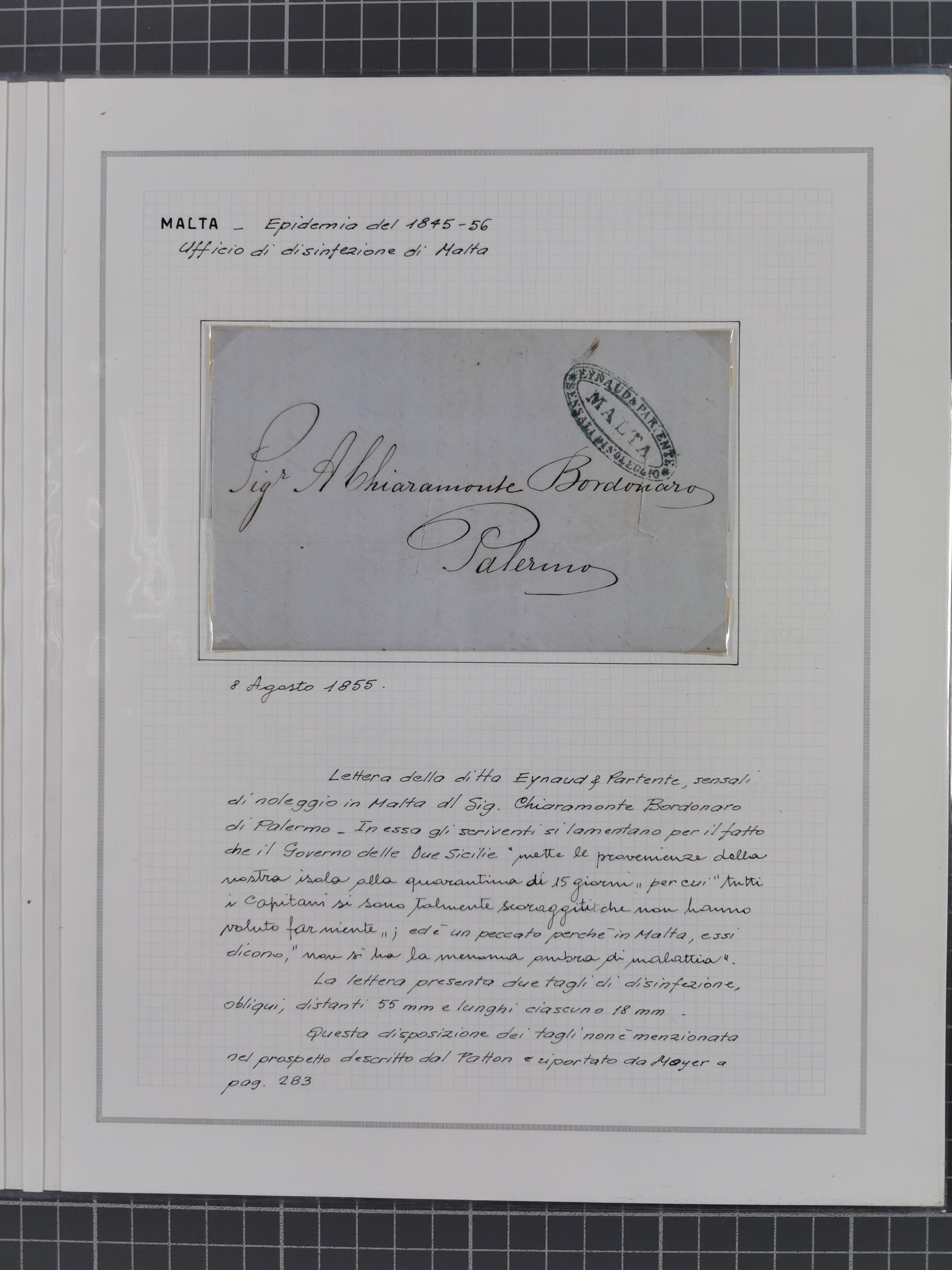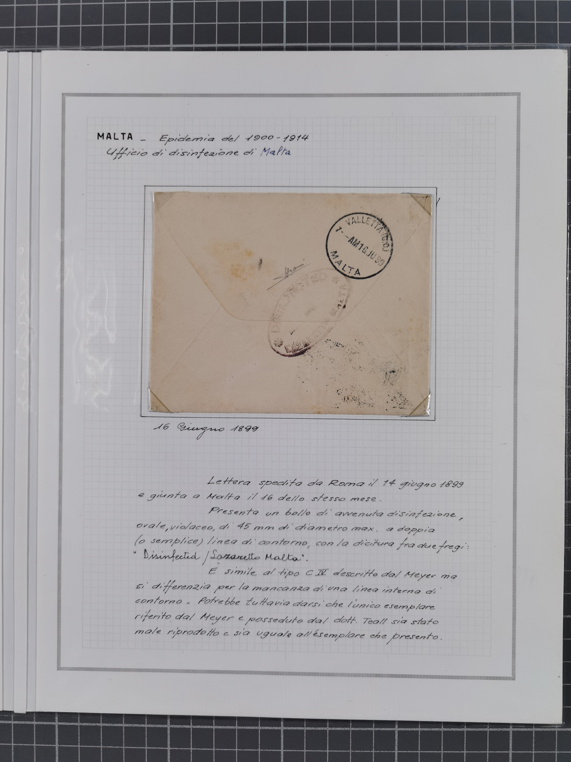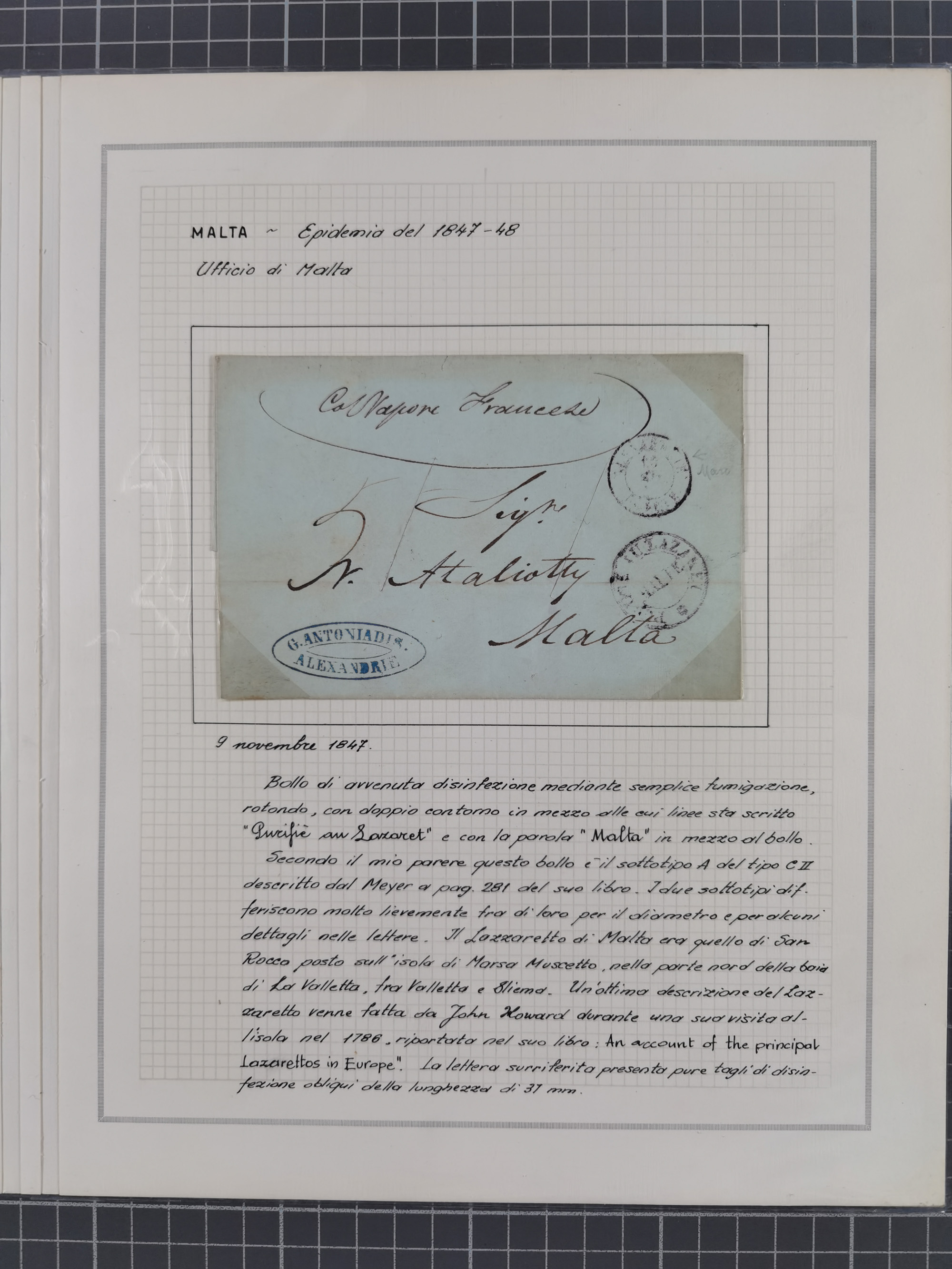 MALTA: 1836/1900, 7 Desinfektionsbriefe. Dazu ein Rapport von 1836 mit der Anzahl der Cholerafälle und Todeszahlen. Sehr interessant. Sauber beschrieben im Album