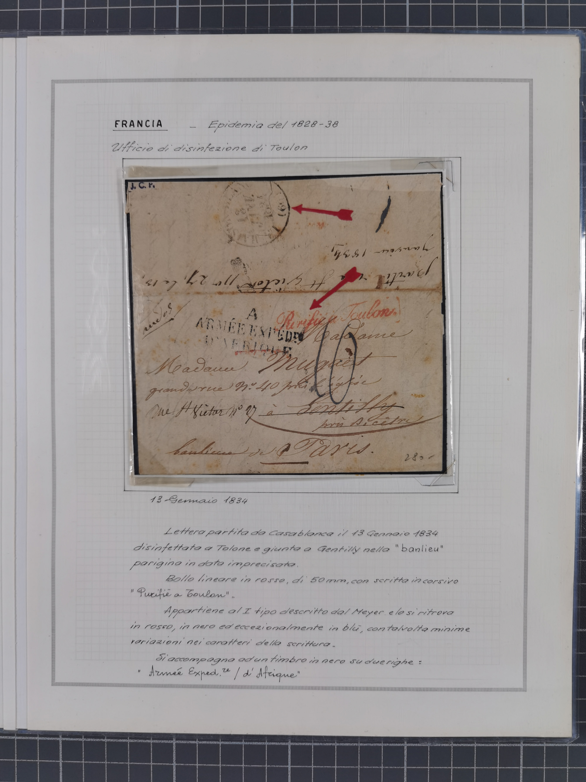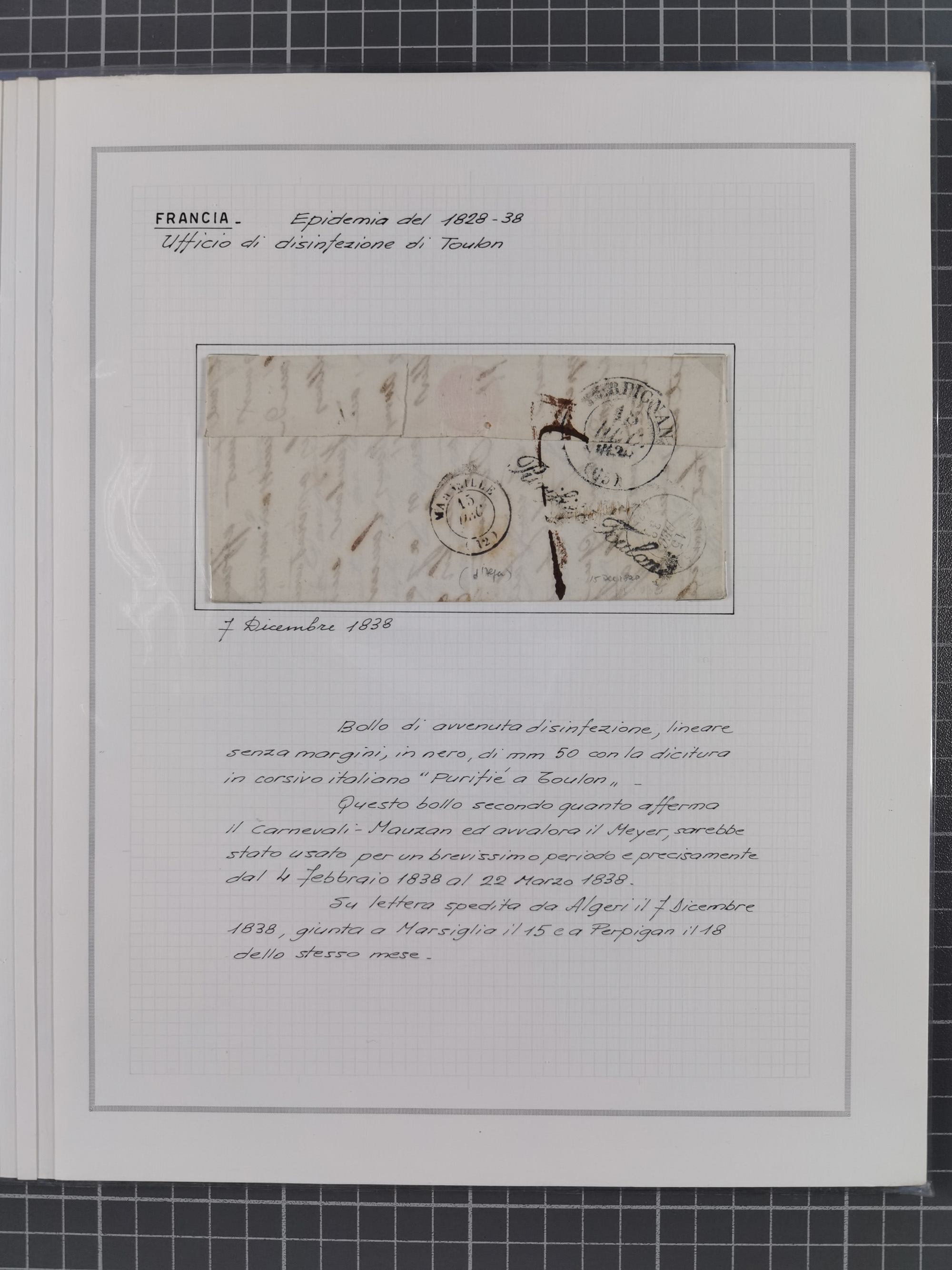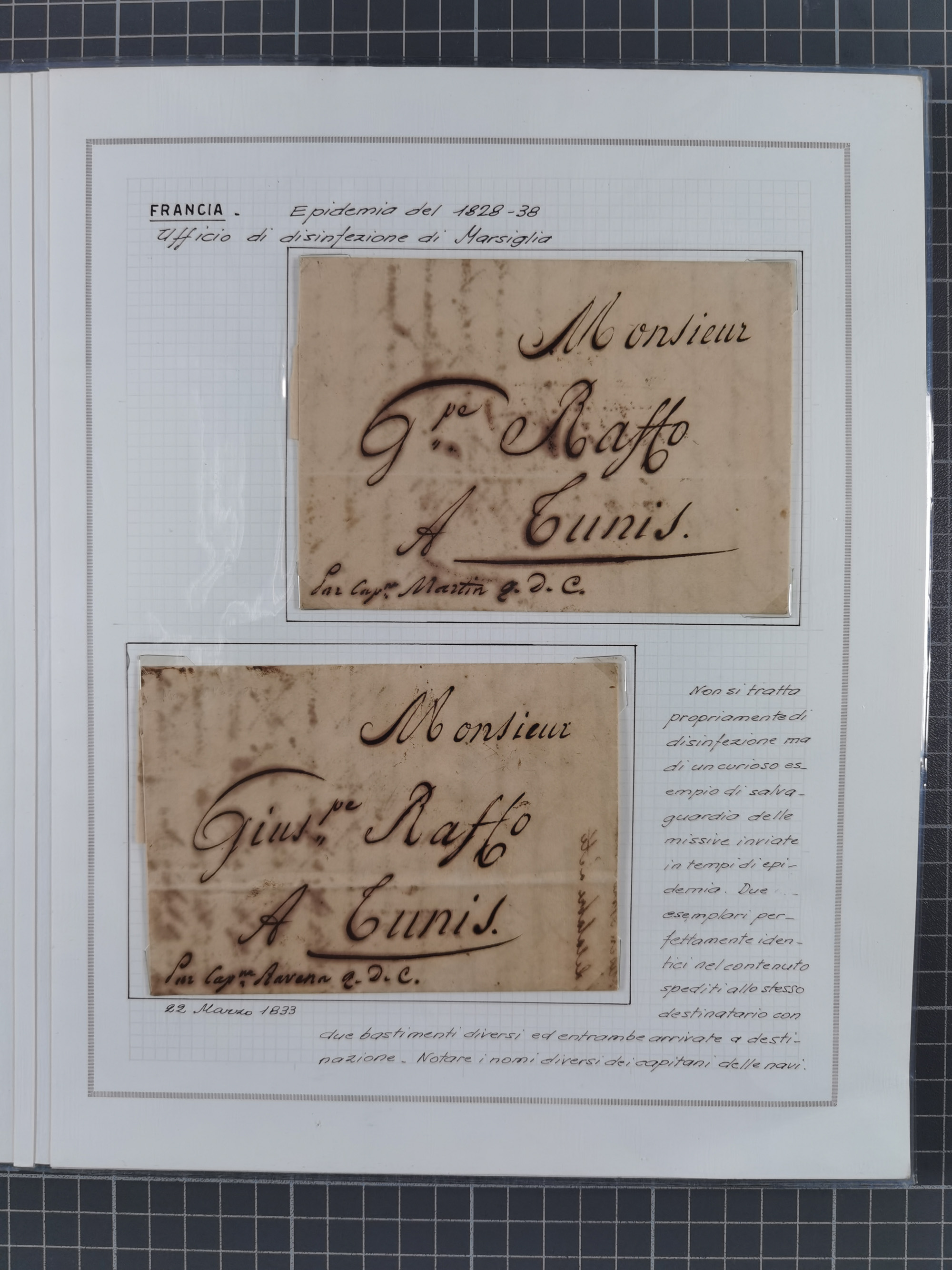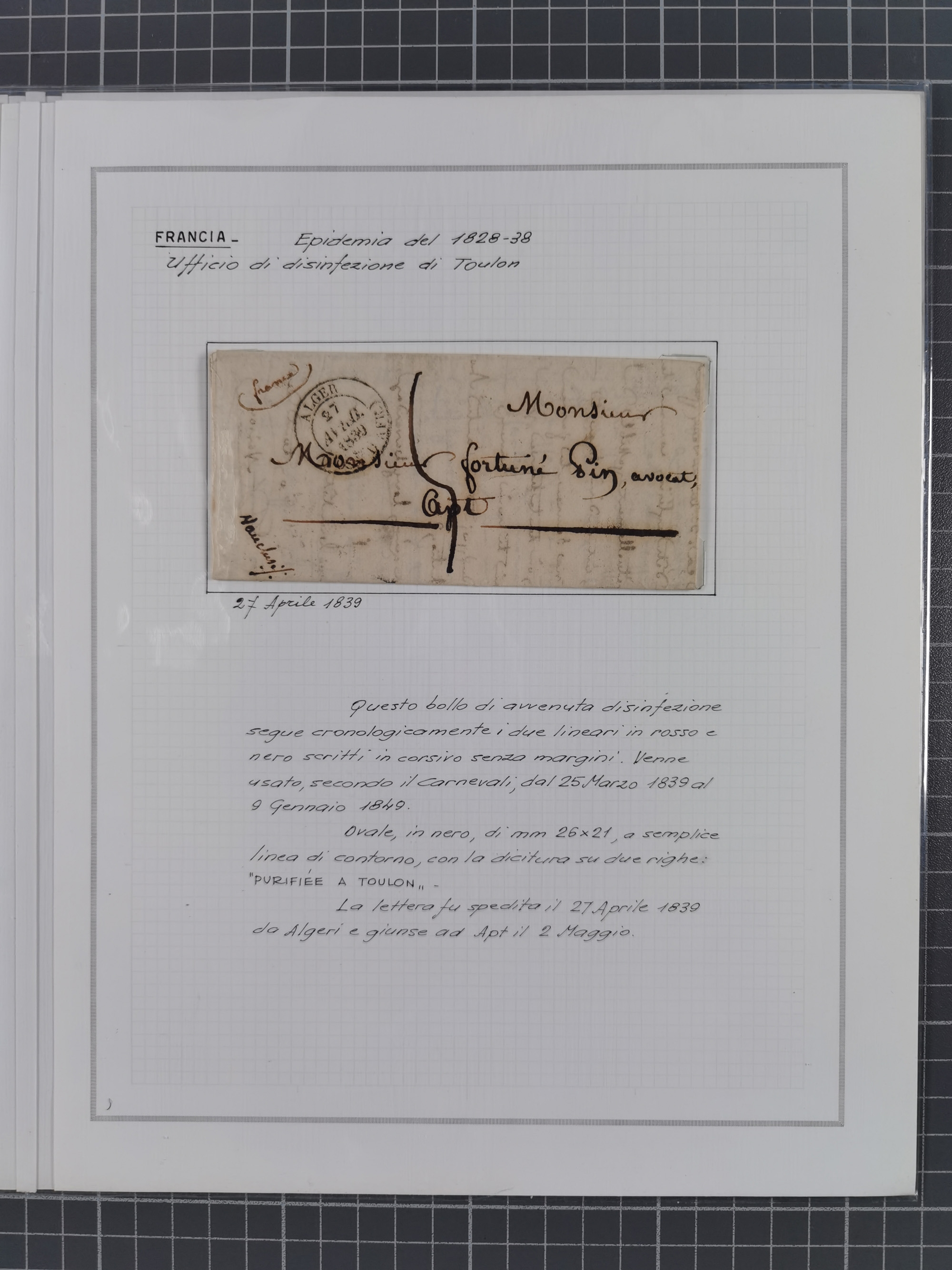 FRANKREICH: 1827/49, 14 Desinfektionsbriefe, dabei u.a. 2 interessante Briefe nach Tunis aus 1833, mit dem gleichen Inhalt und Empfänger, jedoch gelaufen über zwei verschiedene Schiffskapitäne, sowie Brief aus 1834 mit L3 “A ARMEE EXPED AFRIQUE” und L1 “Purifie a Toulon” in rot, etc., detailliert beschrieben, im Album