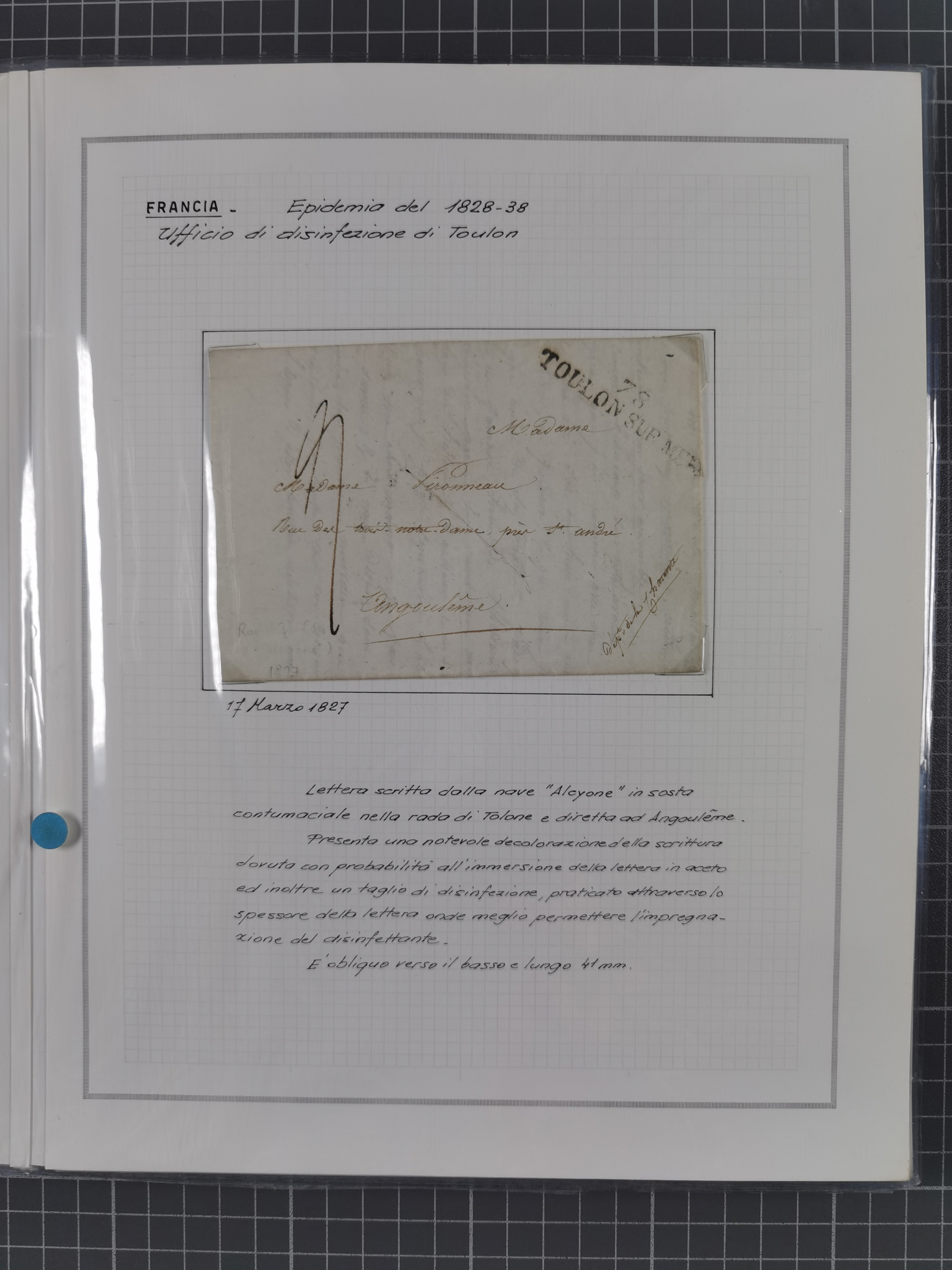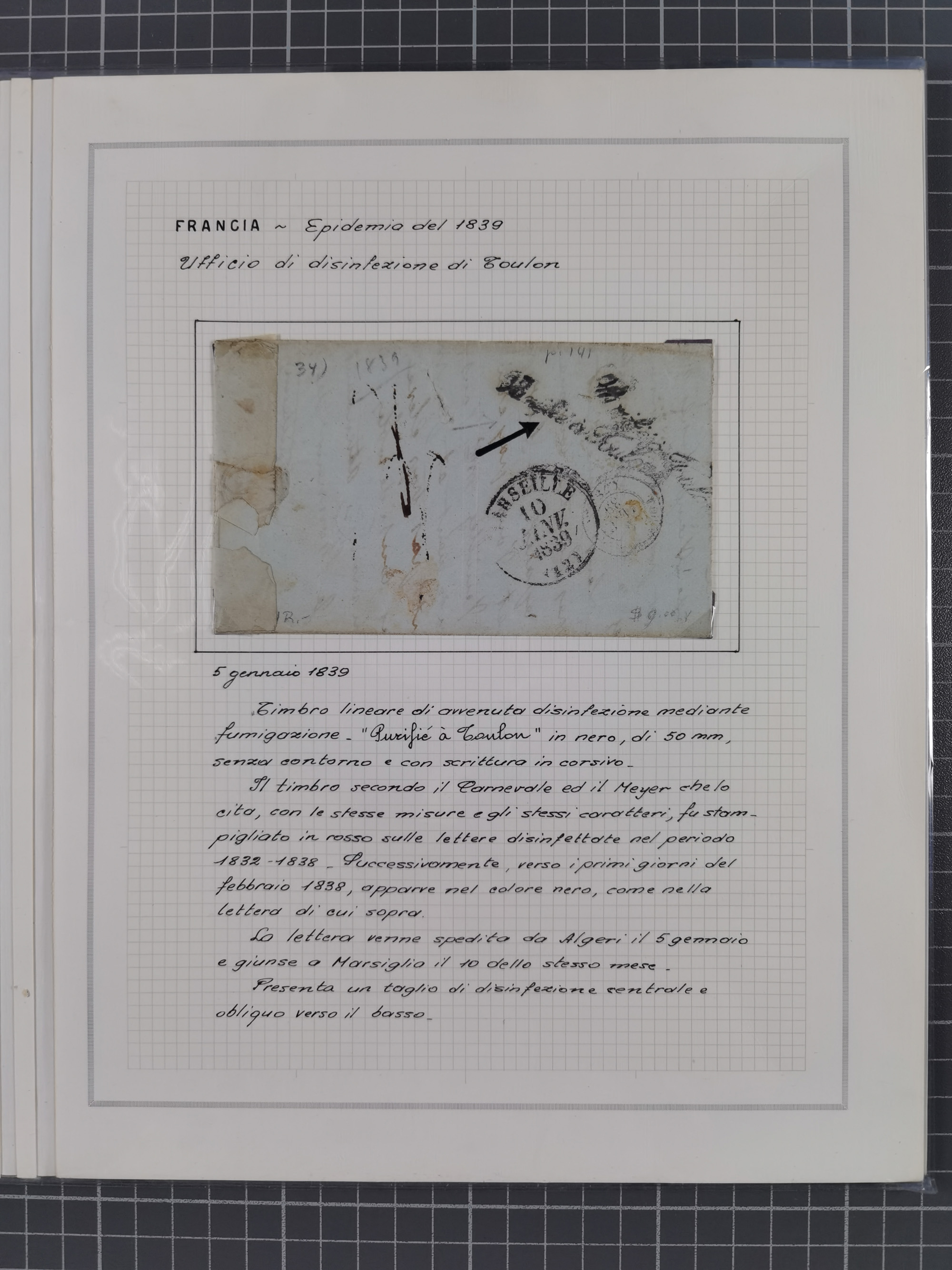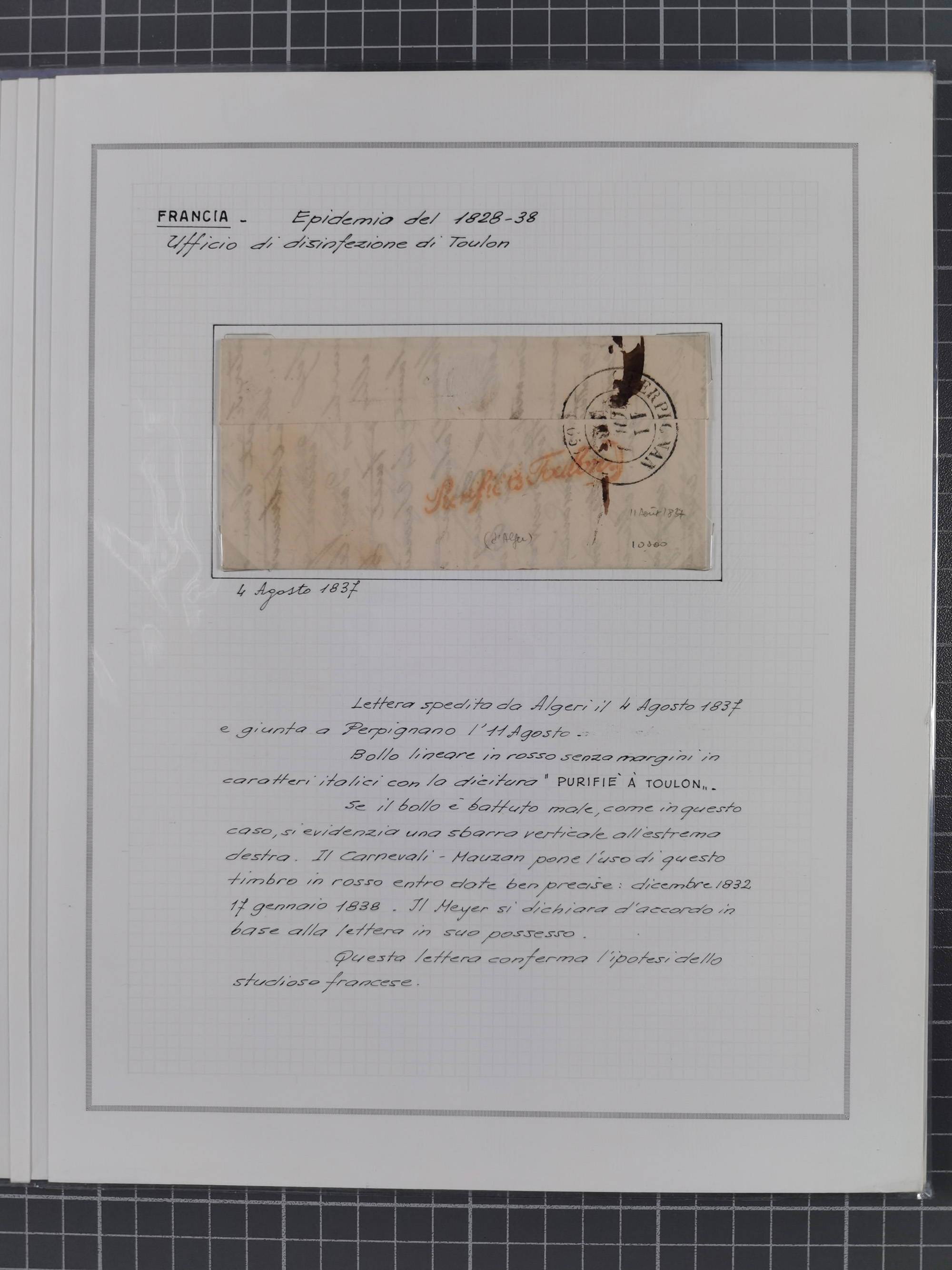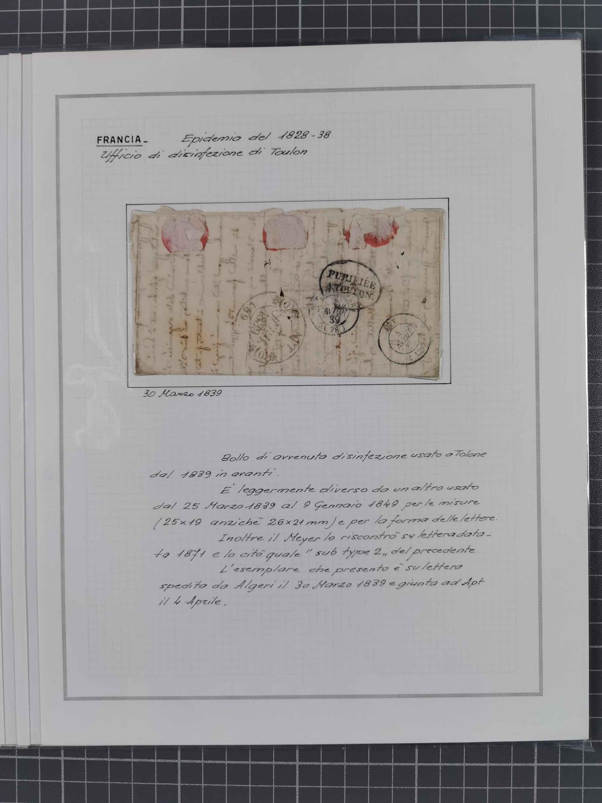 FRANKREICH: 1827/49, 14 Desinfektionsbriefe, dabei u.a. 2 interessante Briefe nach Tunis aus 1833, mit dem gleichen Inhalt und Empfänger, jedoch gelaufen über zwei verschiedene Schiffskapitäne, sowie Brief aus 1834 mit L3 “A ARMEE EXPED AFRIQUE” und L1 “Purifie a Toulon” in rot, etc., detailliert beschrieben, im Album