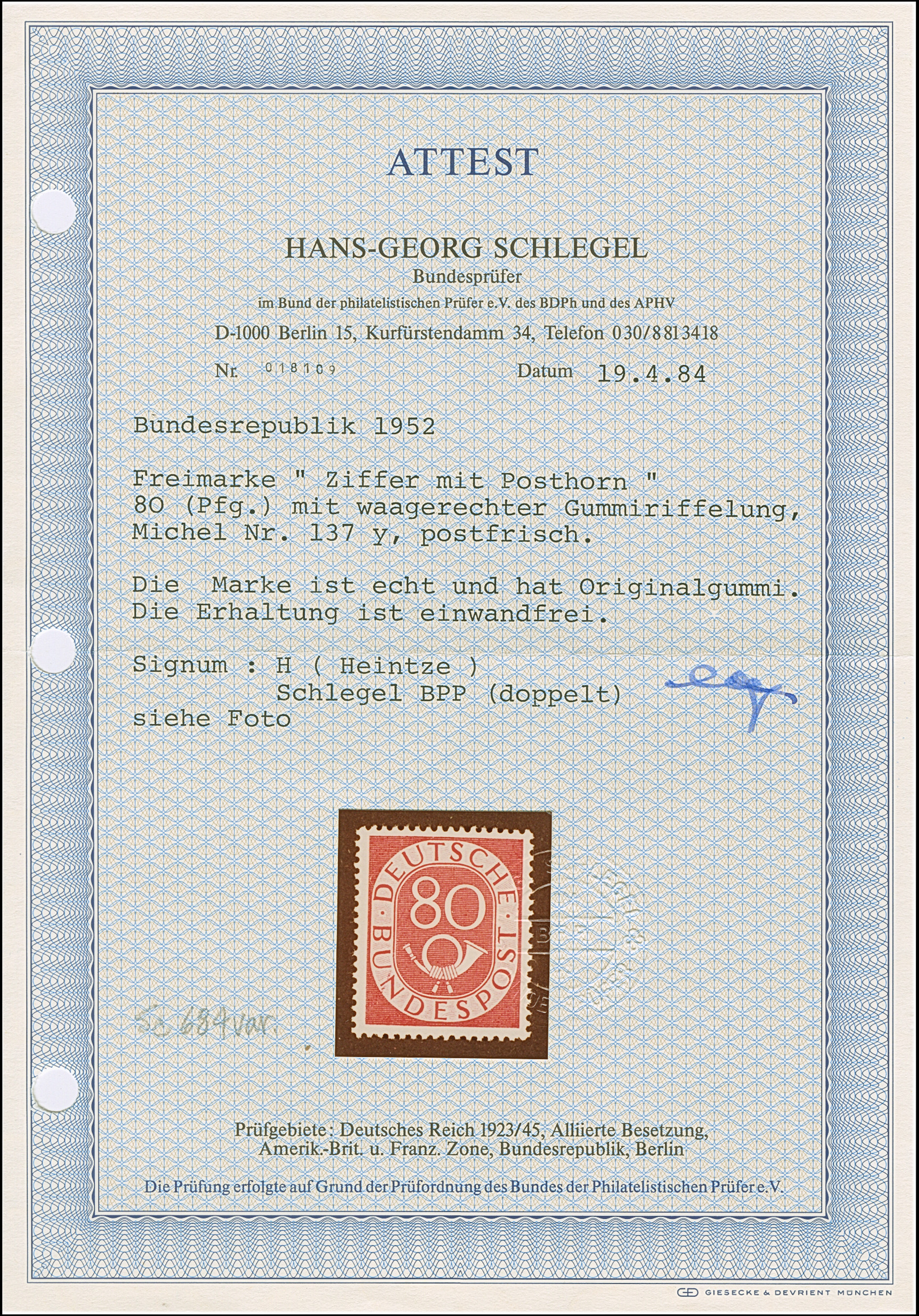 Posthorn 80 Pfg. mit Wasserzeichen 4Y, postfrisch, in einwandfreier Erhaltung, signiert H (Heinze) und doppelt signiert Schlegel BPP mit Fotoattest (1984)