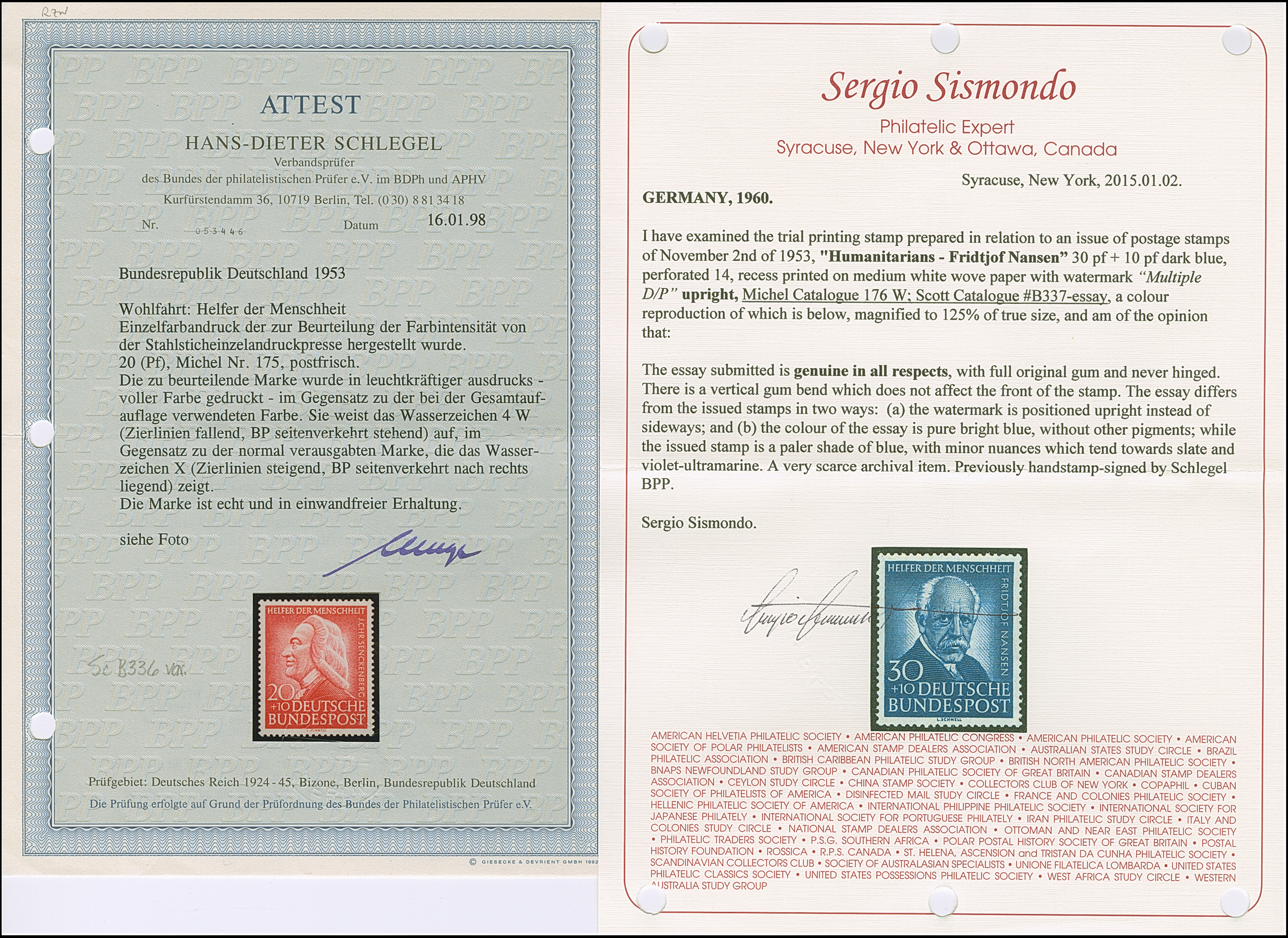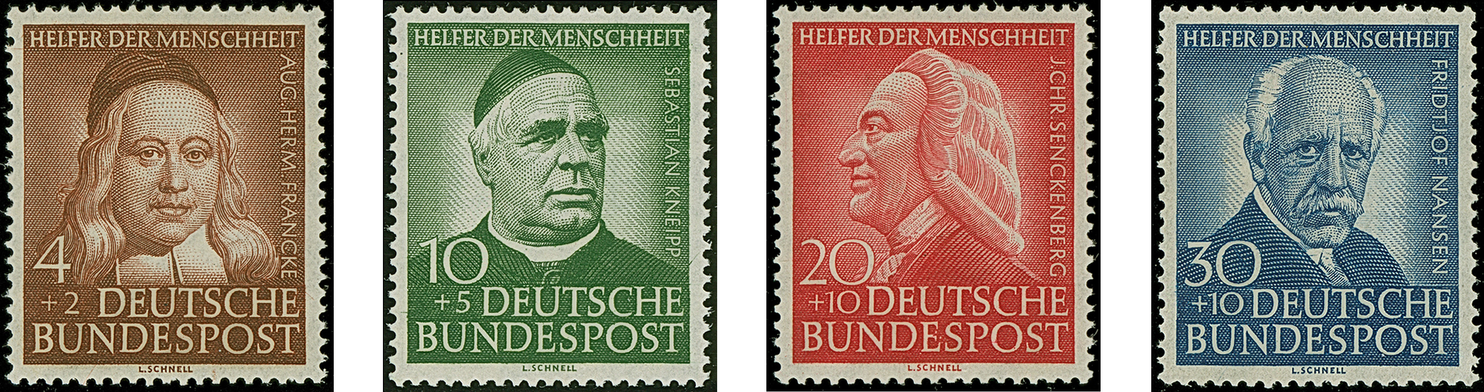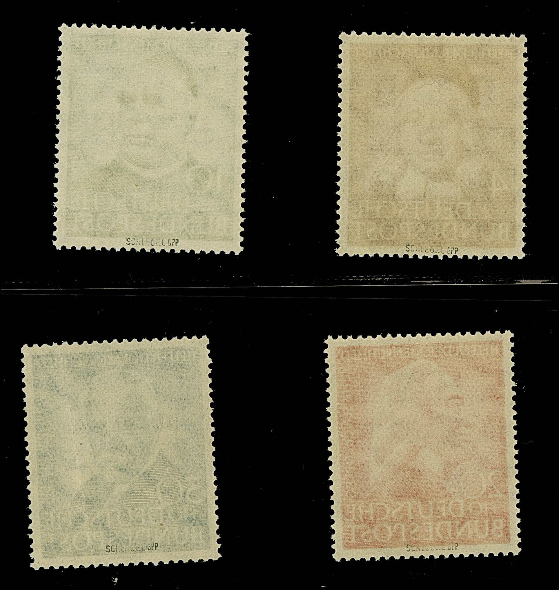 1951, Einzelfarbandrucke Wohlfahrt 4-30 Pfg. je mit Wasserzeichen 4 W und mit leuchtkräftigen, ausdrucksvollen Farben, postfrisch, der Höchstwert mit stärkerem, senkrechten Gummibug, ansonsten in einwandfreier Erhaltung. Eine der ganz wenigen bekannten Sätze, alle Marken signiert Schlegel BPP mit drei Fotoattesten Schlegel bzw. D. Schlegel BPP (1996-98) sowie für den Höchstwert Fotoattest Sismondo (2001)
