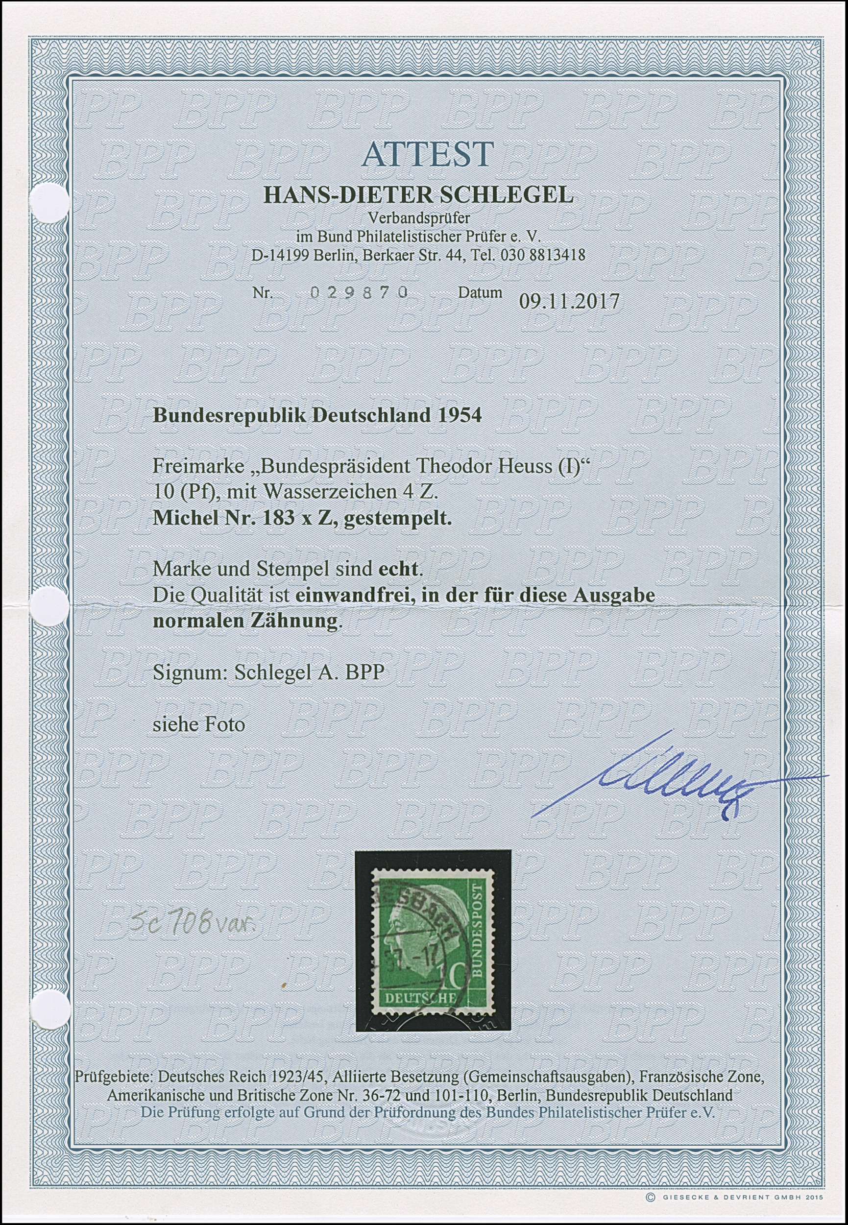 1954, Heuss 10 Pfg. mit Wasserzeichen 4 Z, sauber gestempelt und normal gezähnt, in einwandfreier Erhaltung. Ein sehr schönes Exemplar dieser vermutlich seltensten Wasserzeichen-Abart der Heuss-Serie, bisher wurde nur eine weitere Marke in dieser Art bekannt, signiert A. Schlegel BPP und Fotoattest D. Schlegel BPP (2017)