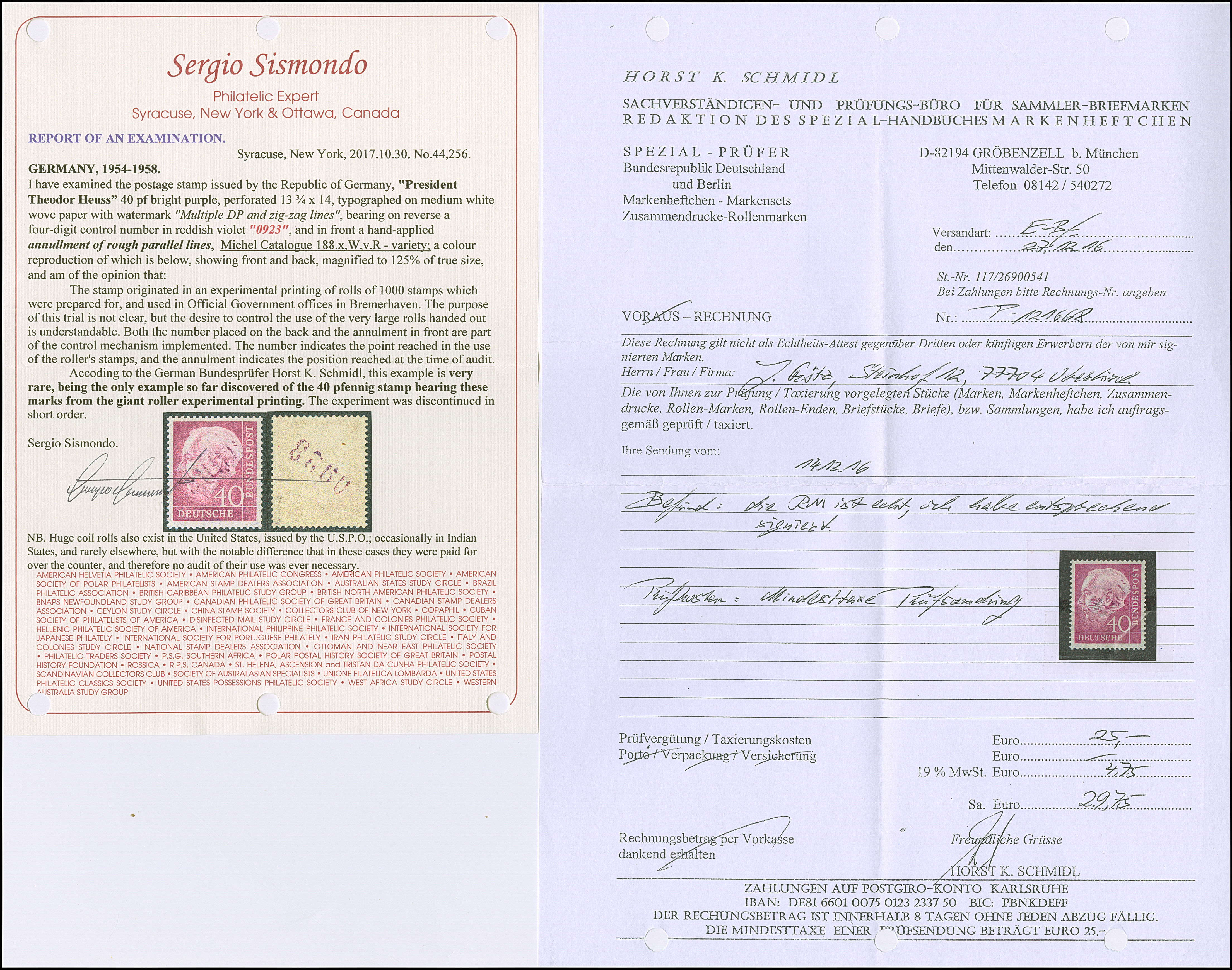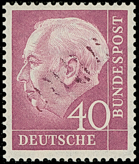 Heuss 40 Pfg. mit rückseitig vierstelliger Handstempel-Nummer als Versuchs-Rollenmarke, postfrisch und in einwandfreier Erhaltung. Diese Rollenmarken wurden beim Postamt Bremerhaven während einer Versuchsphase verkauft, signiert Schmidl und Fotoattest Sismondo (2017)