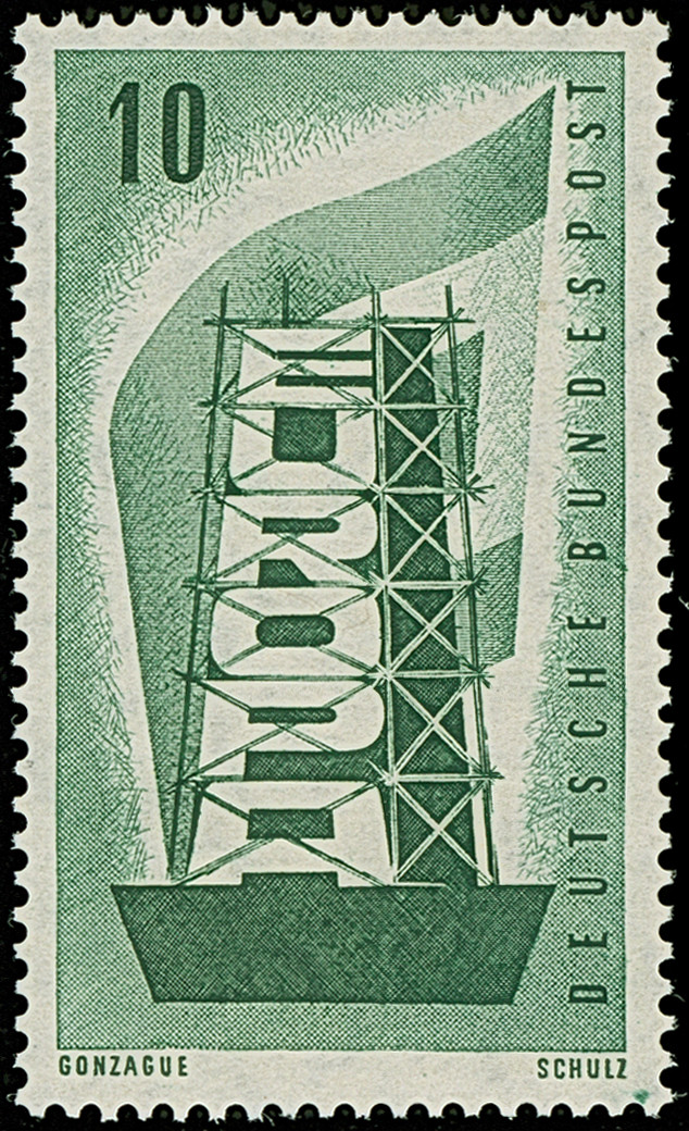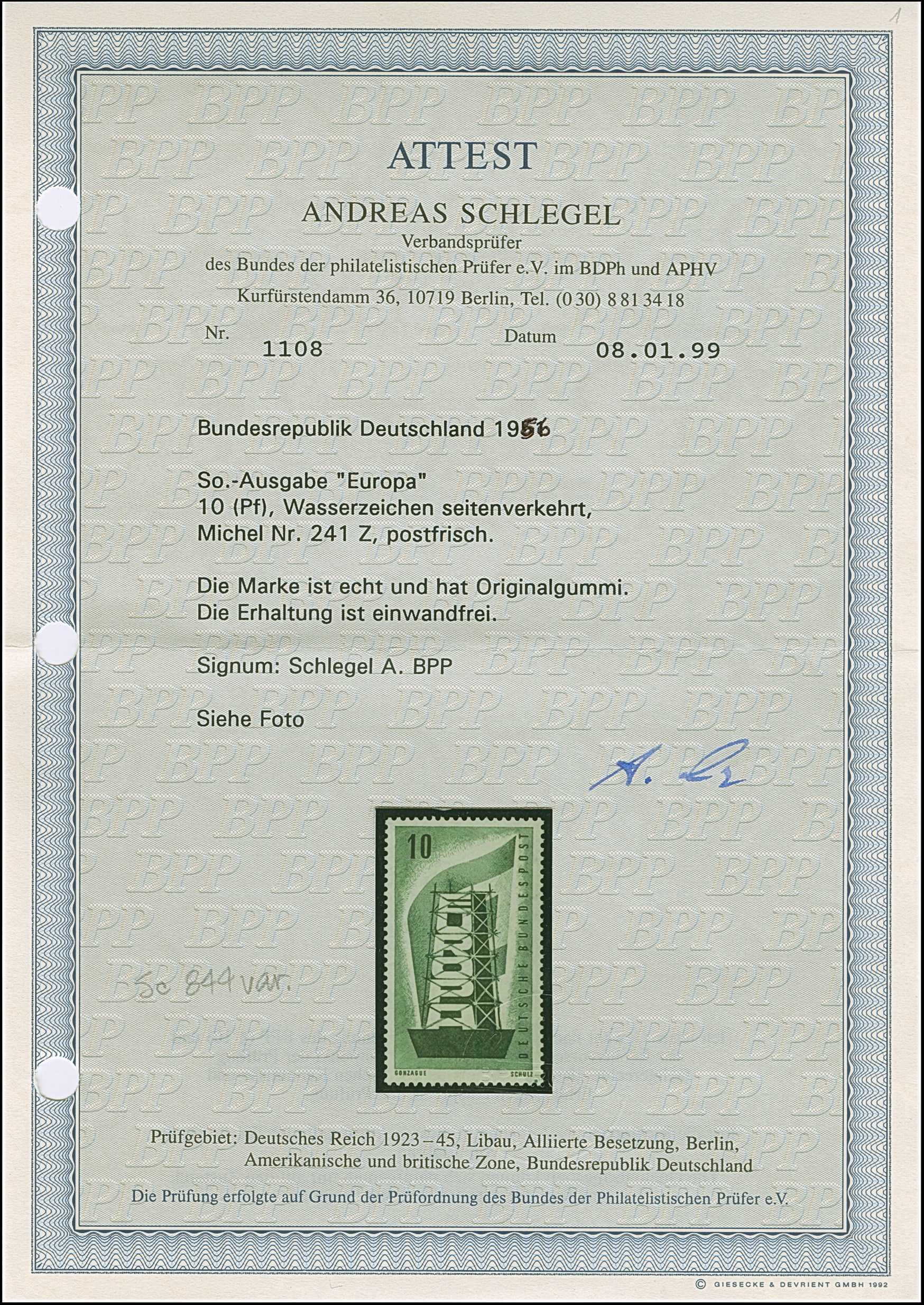 1956, Europa 10 Pfg. mit seitenverkehrtem Wasserzeichen, postfrisch und in tadelloser Erhaltung, signiert A. Schlegel BPP mit Fotoattest (1999)