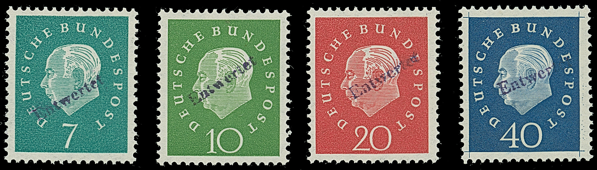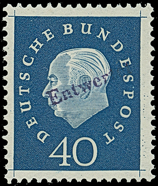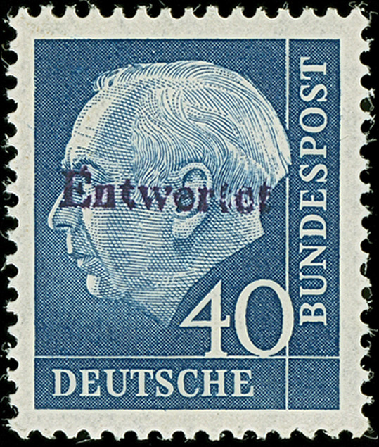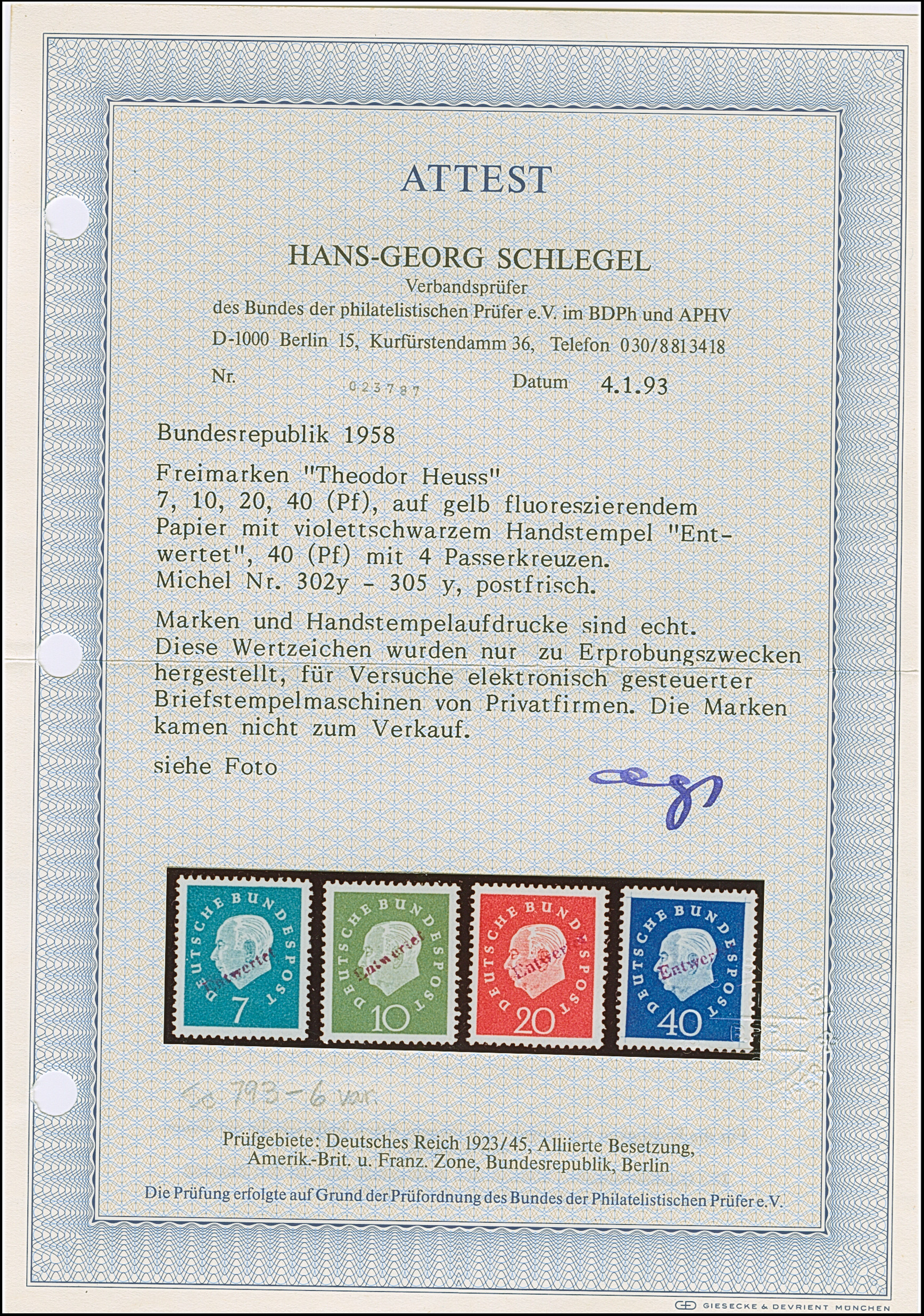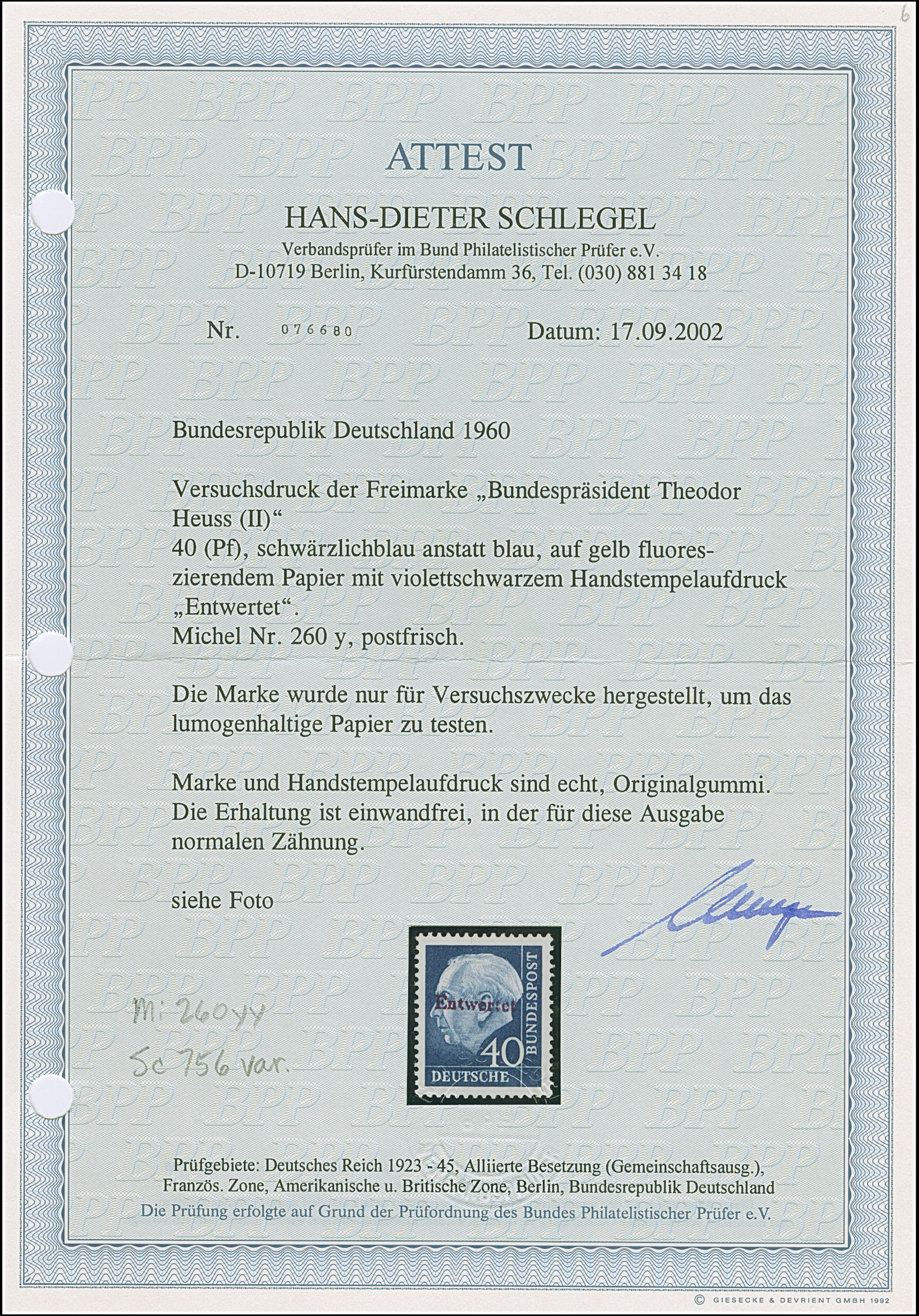 1960, Heuss II 40 Pfg. schwärzlichblau auf gelb fluoreszierendem Papier mit violettschwarzem Handstempel “Entwertet”, postfrisch, normal gezähnt und in einwandfreier Erhaltung. Diese Marken wurden von der Post zum Testen hergestellt, unsigniert mit Fotoattest D. Schlegel BPP (2002)