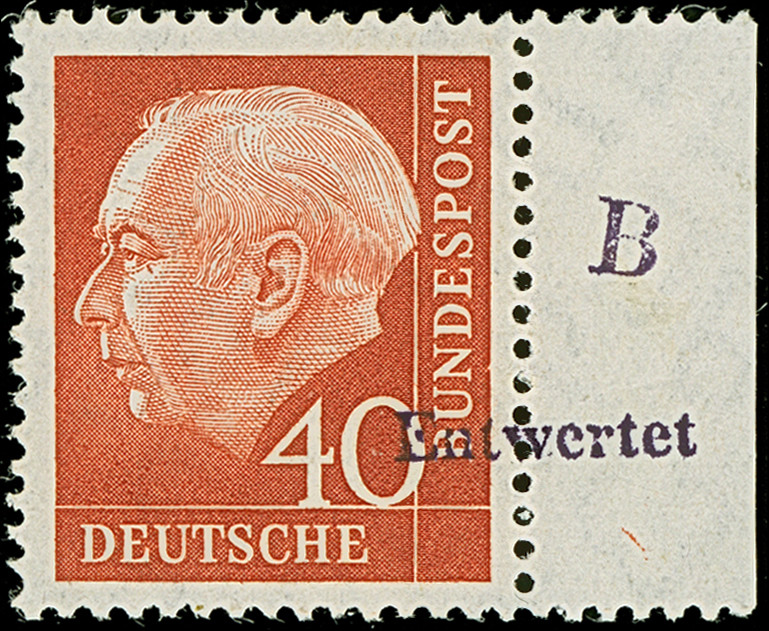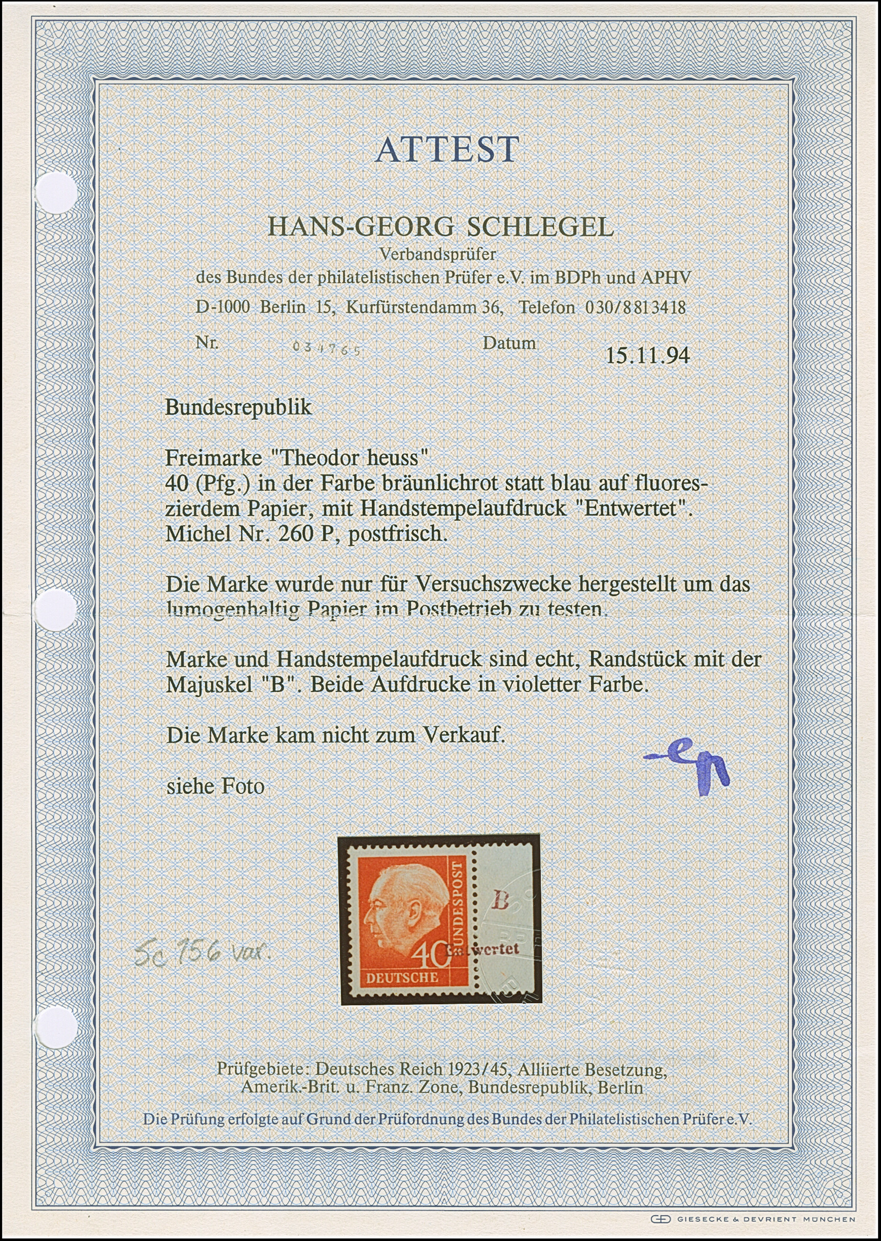 1960, Heuss II 40 Pfg. Probedruck in Bräunlichrot auf fluoreszierendem Papier, Randstück mit Handstempel “Entwertet” und “B”, postfrisch und in einwandfreier Erhaltung. In dieser Art sind bisher nur wenige Probedrucke bekannt, unsigniert mit Fotoattest Schlegel BPP (1994)