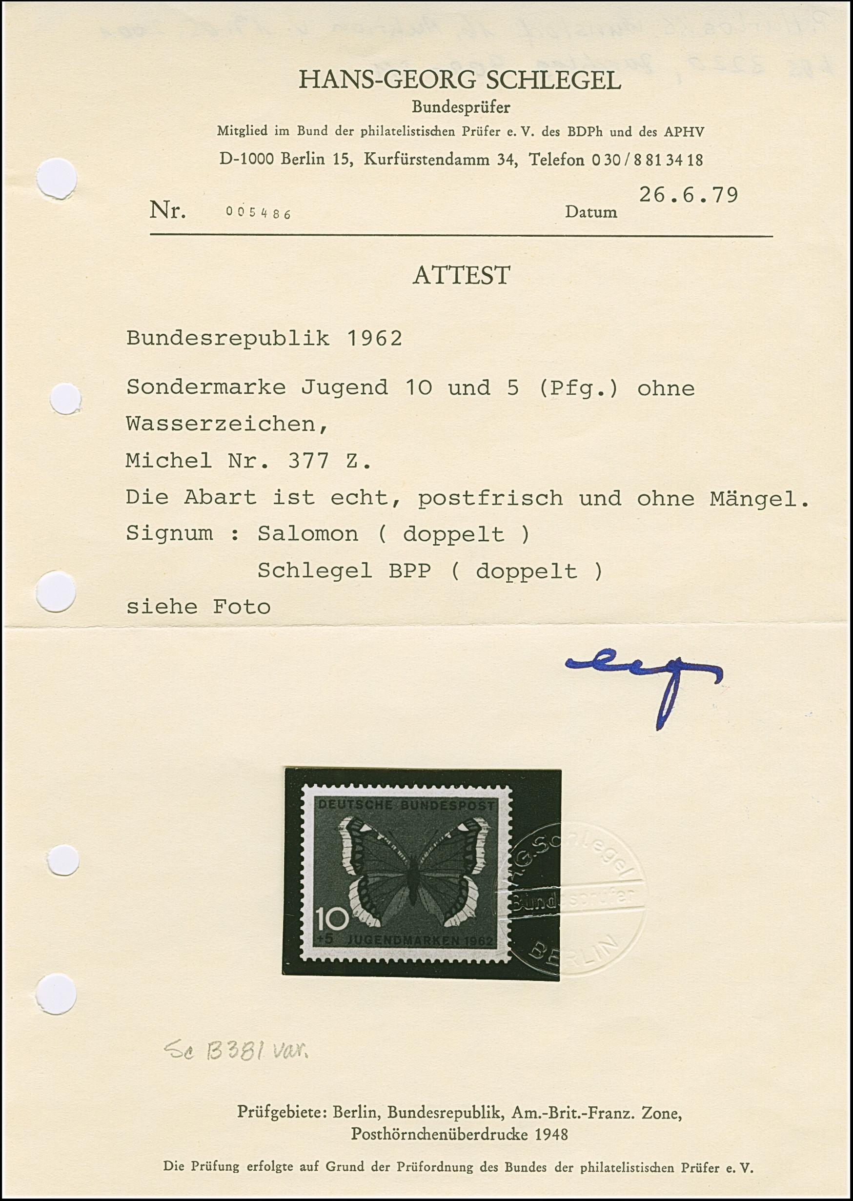 1962, Schmetterlinge 10 Pfg. ohne Wasserzeichen, postfrisch mit Farbspuren, in einwandfreier Erhaltung, jeweils doppelt signiert Salomon und Schlegel BPP mit Fotoattest (1979)