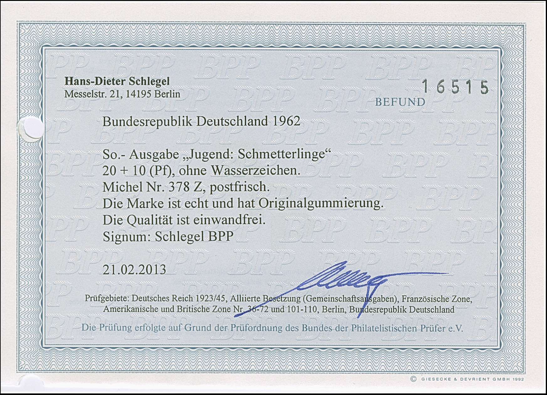 1962, Schmetterlinge 20 Pfg. ohne Wasserzeichen, postfrisch und in einwandfreier Erhaltung, signiert Schlegel BPP und Fotobefund D. Schlegel BPP (2013)