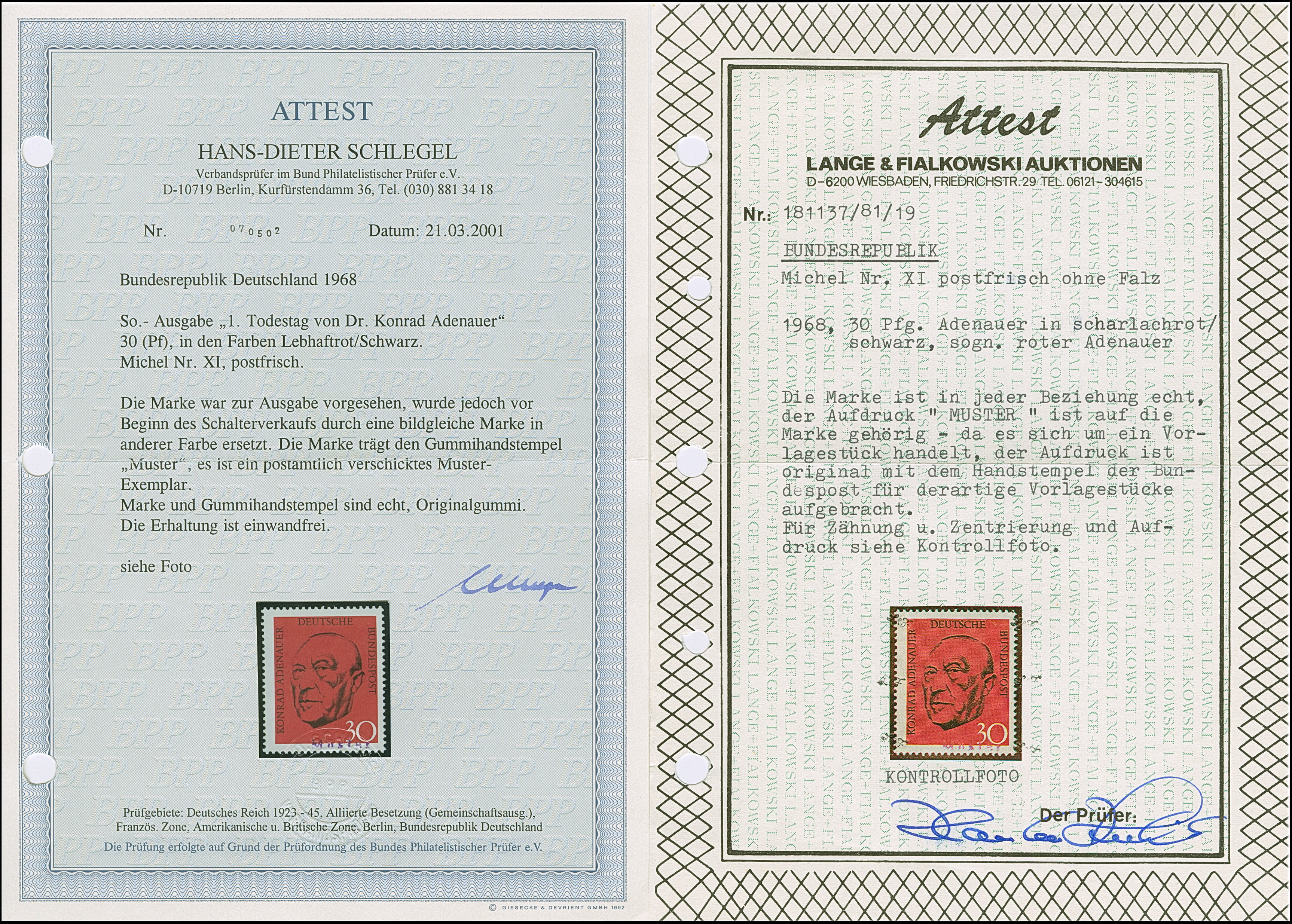 1968, unverausgabte Adenauer” 30 Pfg. in Rot mit Handstempel “Muster”, postfrisch und in tadelloser Erhaltung. Ein schönes Exemplar mit Fotoattest D. Schlegel BPP (2001)