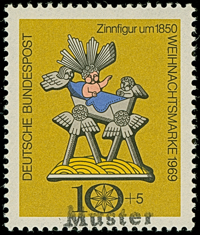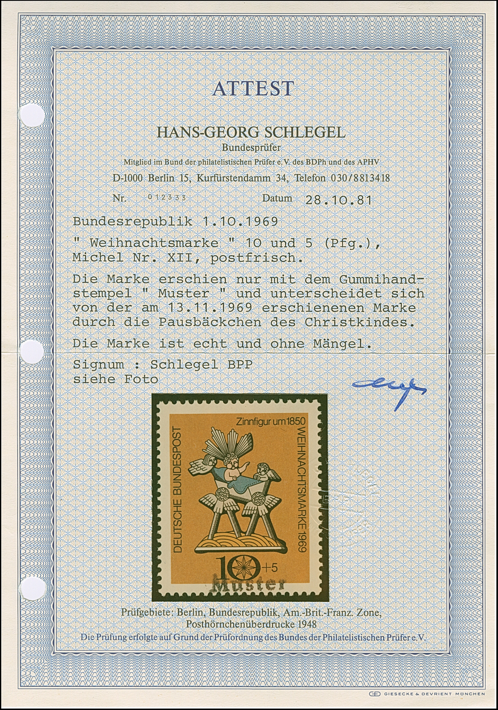 1969, unverausgabte Weihnachten 10 Pfg. ,sogenannte Pausbäckchen-Marke, mit Handstempel “Muster”, postfrisch und in einwandfreier Erhaltung, signiert Schlegel BPP mit Fotoattest (1981)