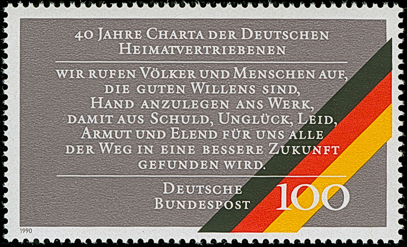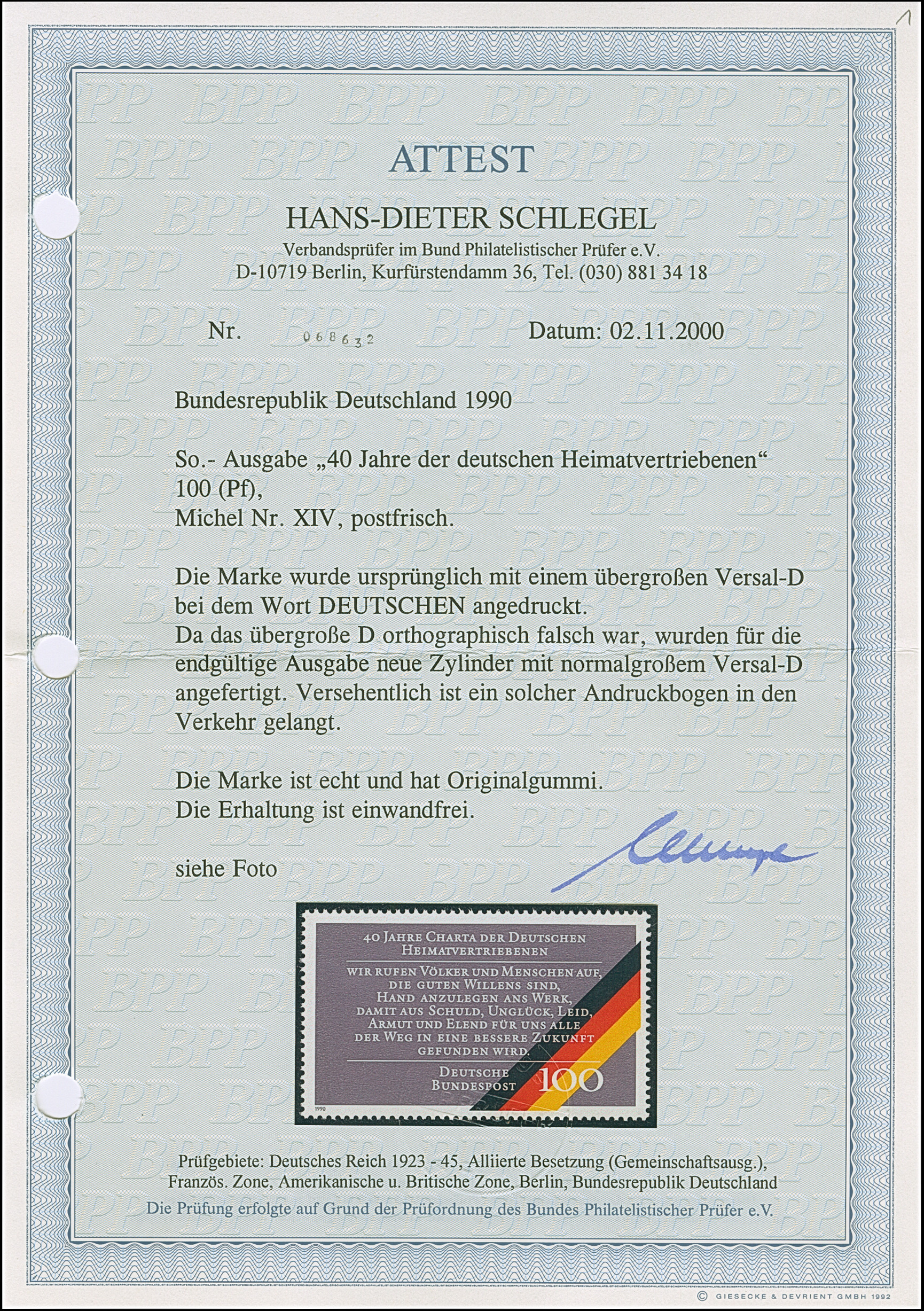 1990, unverausgabte Charta der deutschen Heimatvertriebenen 100 Pfg. mit einem übergroßen Versal-D, postfrisch und in tadelloser Erhaltung. Ein sehr schönes Exemplar dieser Seltenheit, bisher sind nur ganz wenige Marken bekannt, unsigniert mit Fotoattest D. Schlegel BPP (2000)