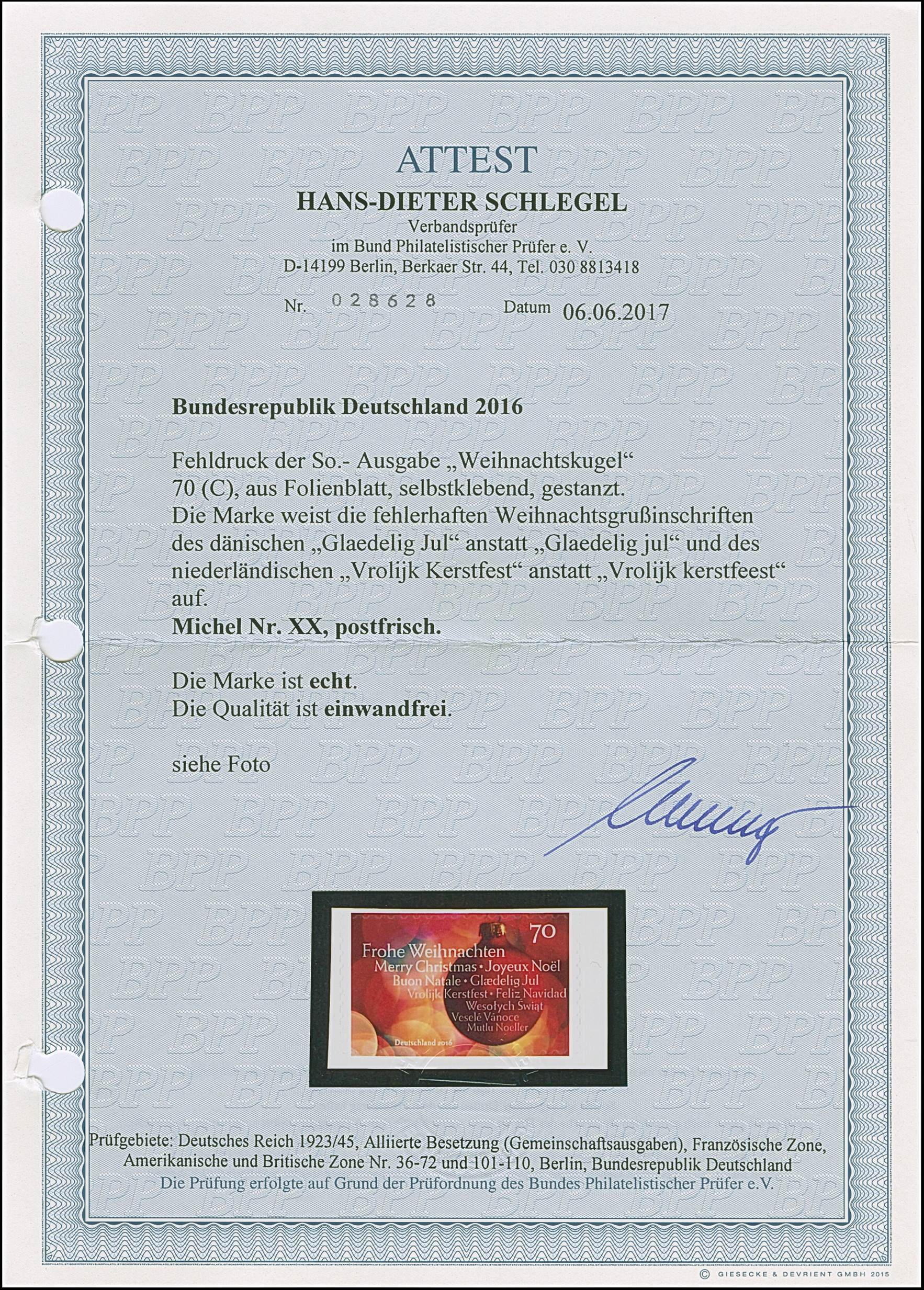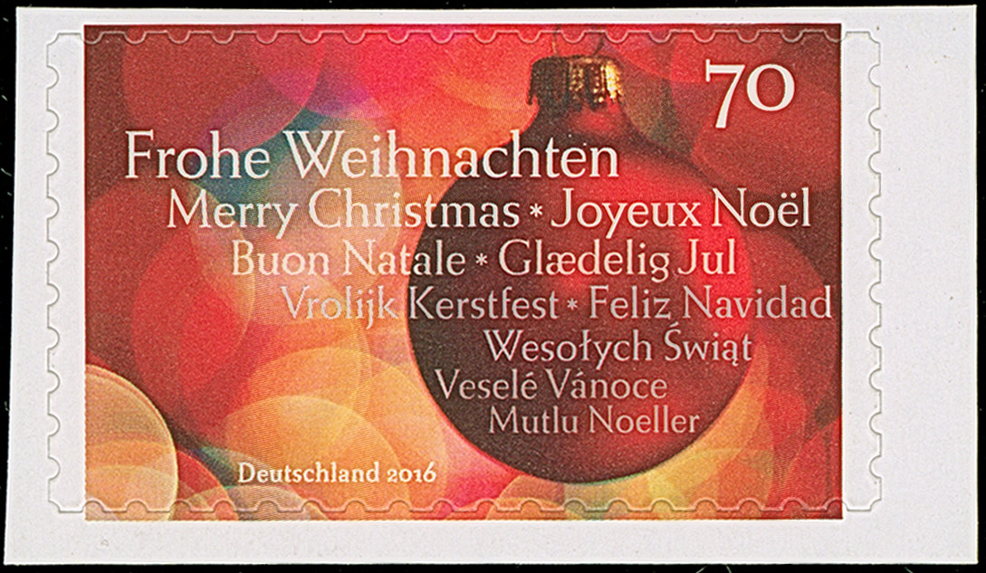 2016, unverausgabte Weihnachtskugel 70 C. mit fehlerhafter Inschrift “Kerstfest und Jul”, selbstklebend, postfrisch auf Trägerfolie, in tadelloser Erhaltung, Fotoattest D. Schlegel BPP (2017)