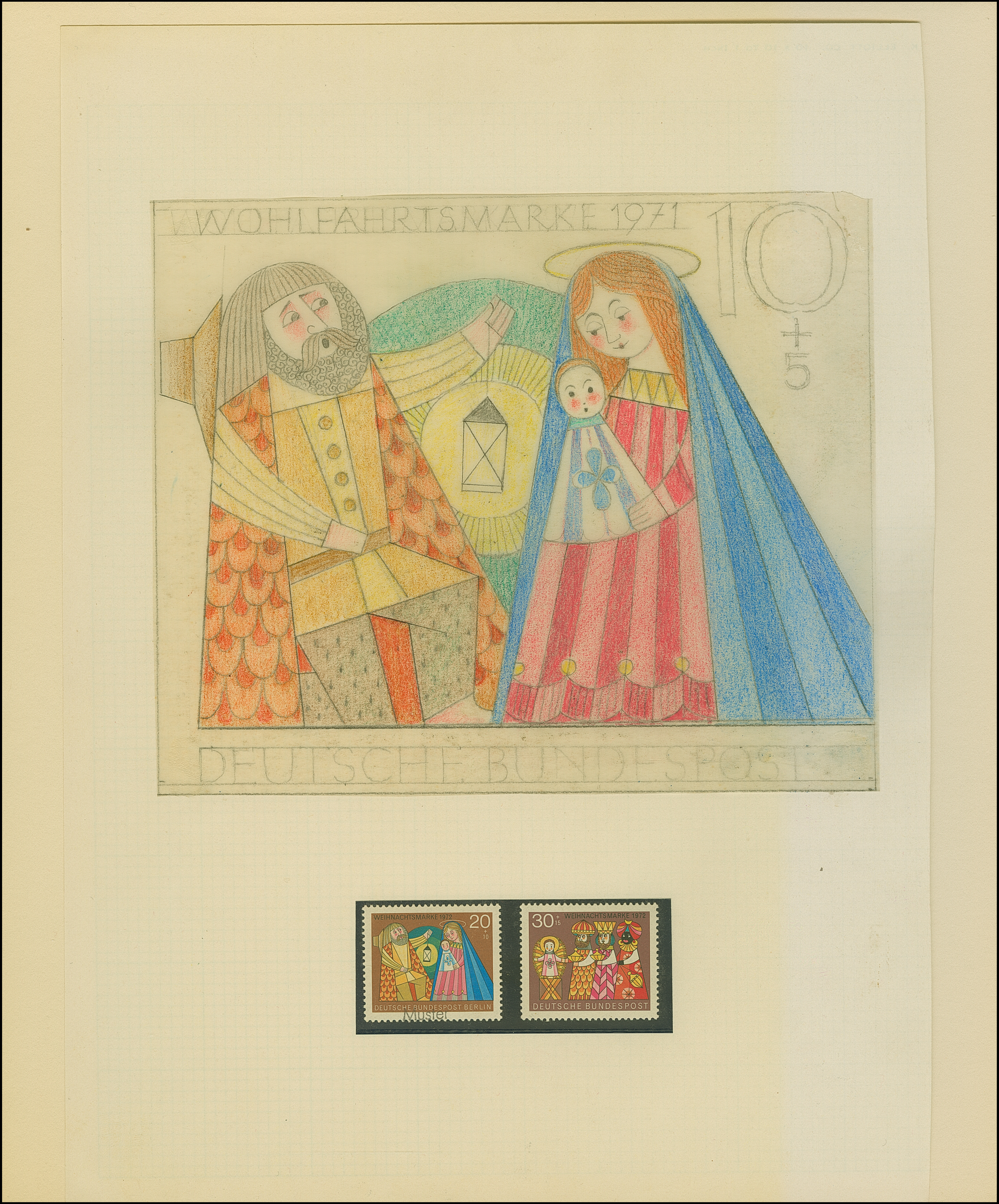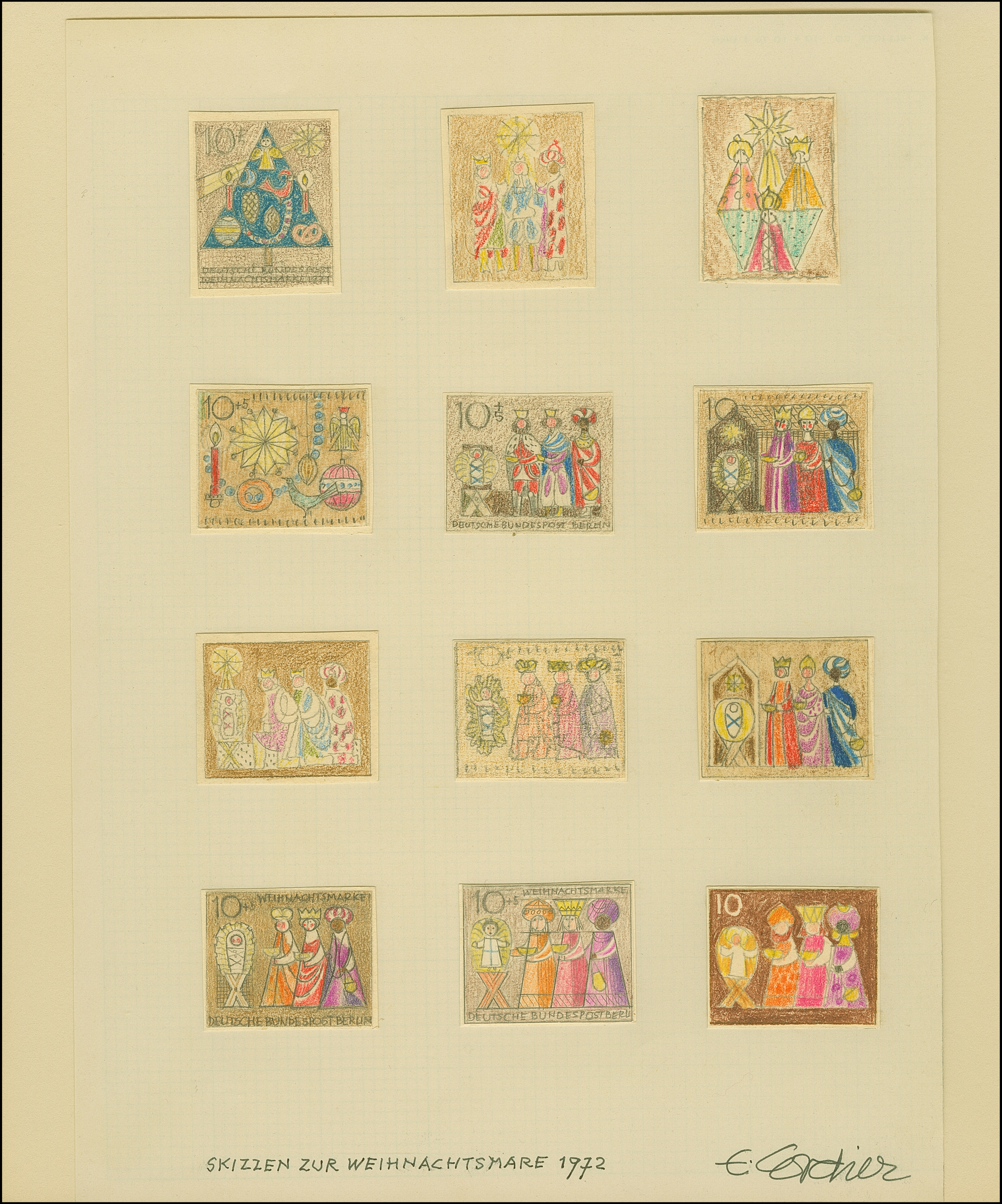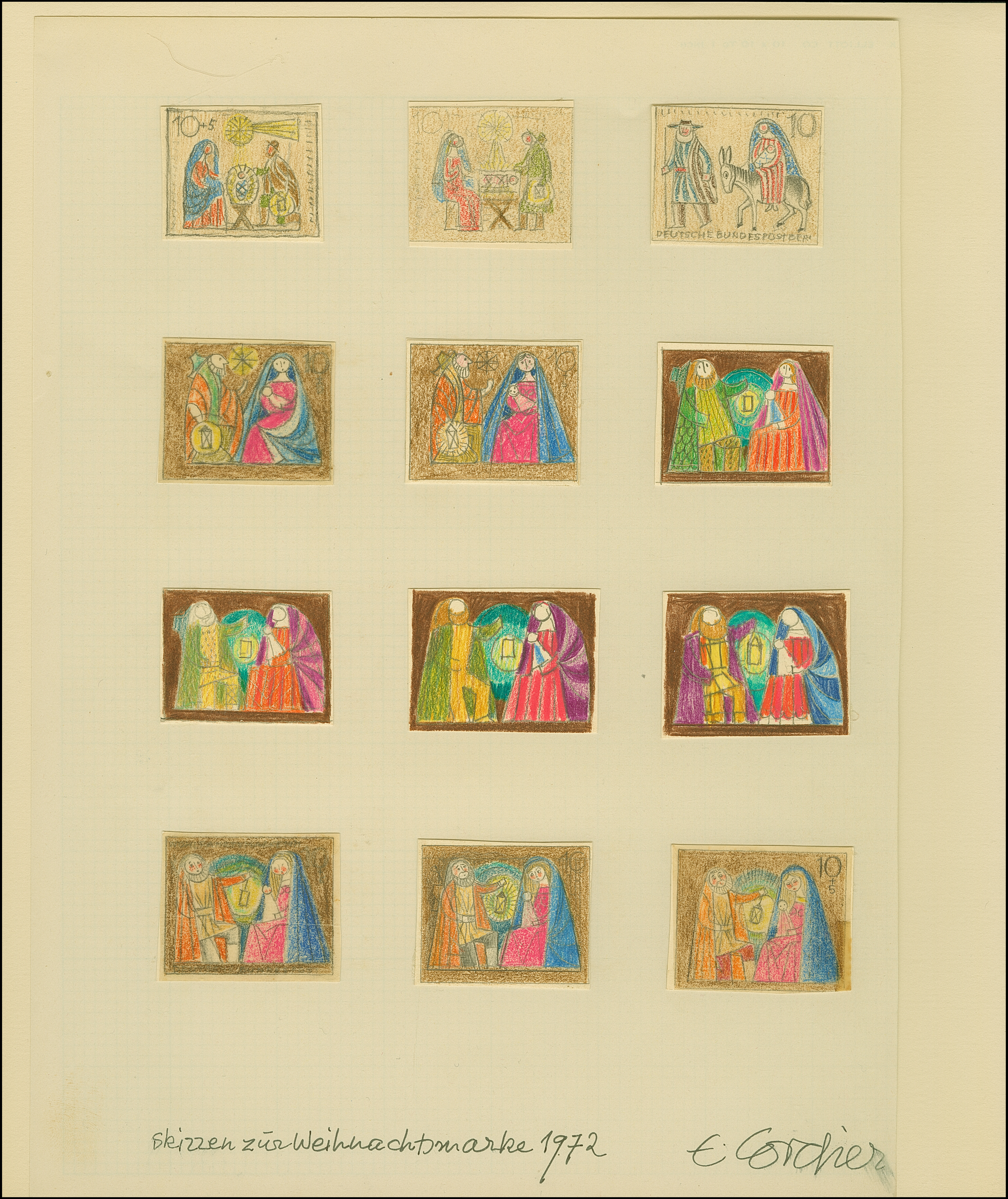 1972, Weihnachtsmarke 30 Pfg. als Entwurf, 24 farbige Skizzen im kleineren Format mit verschiedenen Motiven und mit Wertangabe “10 (Pfg).”, montiert auf zwei DIN A4 Seiten mit eigenhändiger Unterschrift des Entwerfers E. Cordier. Dazu zwei größere Entwürfe mit ähnlichen Motiven für die Berliner-Ausgabe (einmal mit Inschrift “Deutsche Bundespost”), davon ein Blatt mit roter Unterschrift Cordier, in guter Erhaltung