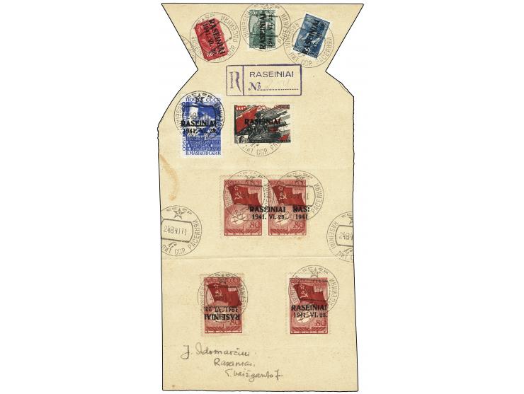 Nordpol 80 K. karmin sowie 60 K. mit kopfstehendem Aufdruck und Nordpol 80K. im waagerechten Paar mit stark verschobenem Aufdruck sowie weitere Zufrankatur, je mit russischem Gefälligkeitsstempel "RASEINIAI 24 8 41" auf großem R-Briefstück, teils minimal stockig sonst in guter Erhaltung, Fotoattest Huylmans BPP