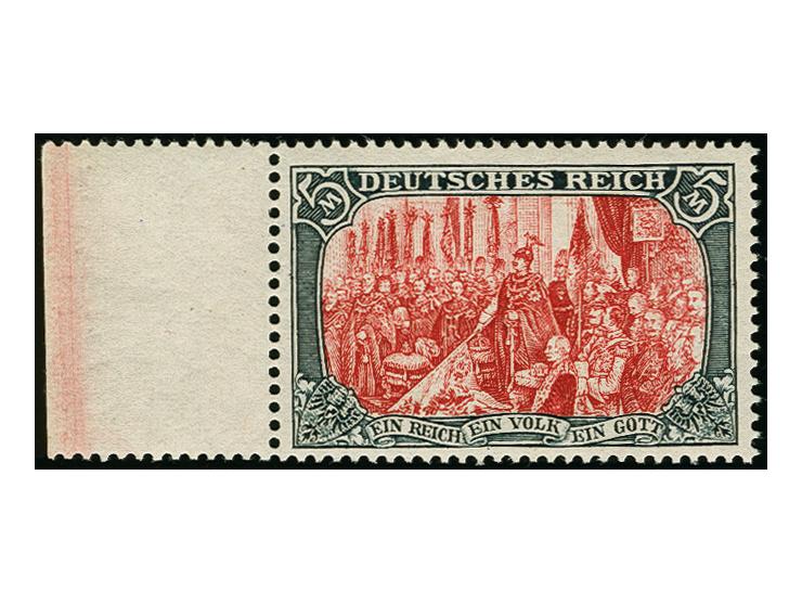 5 Mark grünschwarzdunkelkarmin, 26:17 Zähnungslöcher, linkes Seitenrandstück, postfrisch, tadellos, u.a. signiert Pfenninger und Fotoattest Jäschke BPP (1983)