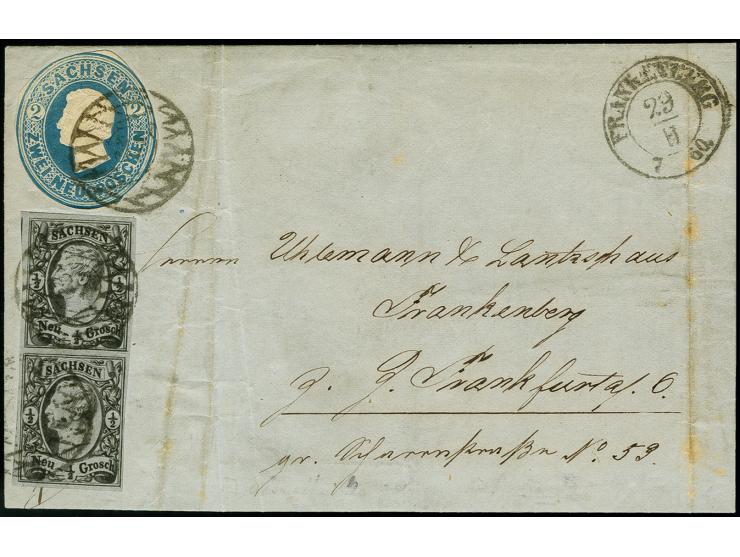 2 Ngr. Johann Ganzsachenausschnitt preußischblau, rund geschnitten, mit ½ Ngr. Johann im senkrechten Paar je mit Nr. "37" entwertet, auf Brief mit DKr. "FRANKENBERG 29 II 60" in den Postverein nach Frankfurt/O., der Faltbrief teils senkrechte Knitter, die Marken breitrandig geschnitten, eine sehr seltene Mischfrankatur, farbfrisch und gut erhalten