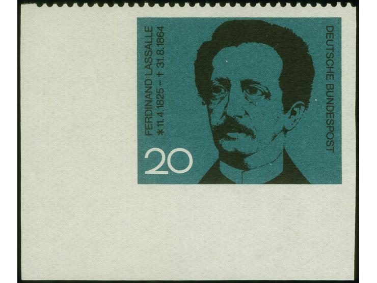 100. Todestag von Ferndinand Lassalle 20 Pfg. nur oben gezähnt aus der linken unteren Bogenecke, postfrisch, tadellos, Fotoattest Schlegel BPP (2023)