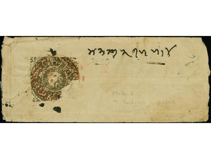 1871 (dated 1288): Shahi black, Plate A, position 8, cut square, used on cover to Kabul, cancelled by bite and red sealcancel of Peshawar, very fine