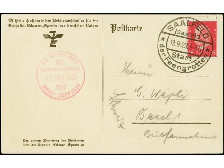 1929, Deutschlandfahrt, Teil I mit Abwurf Saalfeld, Karte mit Bordstempel vom 12.9. und Reichspräsidenten 15 Pfennig mit Werbestempel "SAALFELD - Stadt der Feengrotten 12.9.29" nach Basel in einwandfreier Erhaltung, Fotoattest Sieger A.I.E.P. (2012)