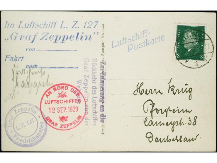 1929, Deutschlandfahrt, Teil I mit Abwurf Jena, Zeppelin-Fotokarte mit Bordstempel vom 12.9. und Reichspräsidenten 8 Pfennig mit Stempel "JENA 12.9.29" sowie zwei privaten Zeppelin-Stempeln nach Pforzheim in einwandfreier Erhaltung, Fotoatteste Dr. Simon (2003) und Sieger A.I.E.P. (2012)