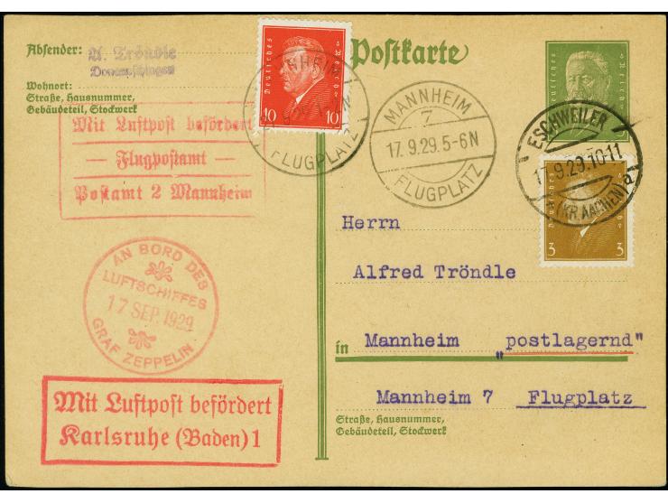 1929, Deutschlandfahrt, Teil II mit Abwurf Eschweiler, Ganzsachenkarte 5 Pfenig mit Zufrankatur und Bordstempel vom 17.9. via Karlsruhe nach Mannheim mit Flugpost-Bestätungsstempel und Reichspräsidenten 10 Pfennig mit Stempel "MANNHEIM FLUGPLATZ 21.9.29", einwandfreie Erhaltung, Fotoattest Sieger A.I.E.P. (2012)