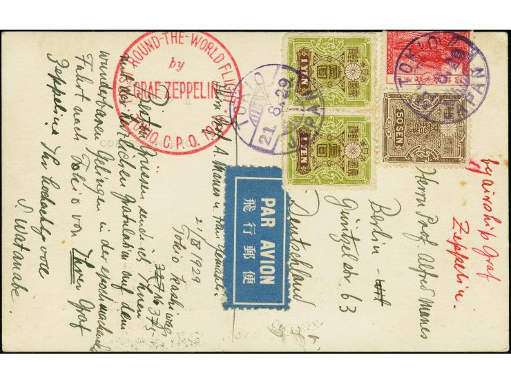 1929, Weltrundfahrt, japanische Post der Etappe Tokio bis Friedrichshafen, Fotokarte mit japanischer Frankatur mit Stempel "TOKIO 21.8.29" und rotem Postsonderstempel nach Deutschland mit Maschinen-Ankunftsstempel von Friedrichshafen. Eine Marke um den Kartenrand geklebt, ansonsten in guter Gesamterhaltung, Fotoattest Sieger A.I.E.P. (2014)