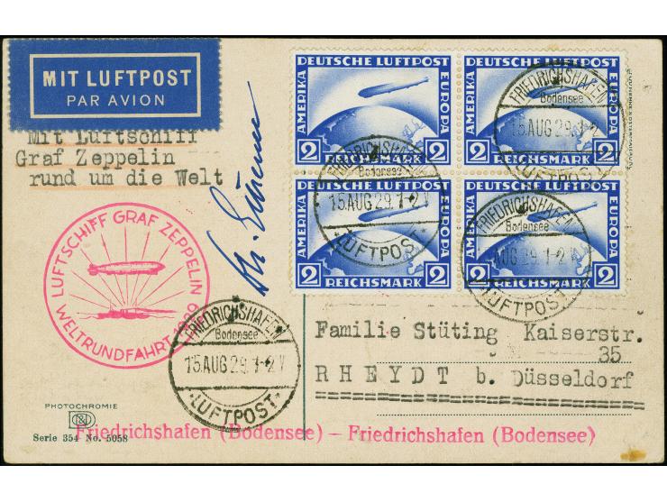 1929, Weltrundfahrt, Etappe Friedrichshafen - Friedrichshafen, Ansichtskarte mit Viererblock Zeppelin-Sondermarke 2 Mark mit Stempel "FRIEDRICHSHAFEN LUFTPOST 15.AUG.29" und nebengesetztem Bestätigungsstempel in Rot sowie roter Leitstempel und eigenhändige Unterschrift von Dr. Hugo Eckener, adressiert nach Reydt mit rückseitig zwei verschiedenen Ankunftsstempeln von Friedrichshafen. Die Karte und die Frankatur ist in einwandfreier Erhaltung, trotz der Überfrankatur um eine Mark ein dekorative und in dieser Kombination seltene Karte, Fotoattest Sieger A.I.E.P. (2014)