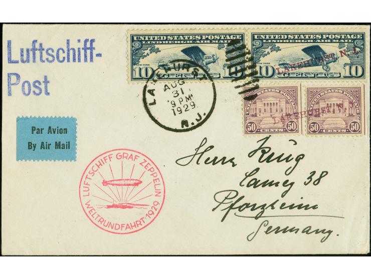 1929, Weltrundfahrt, amerikanische Post der Rückfahrt, Brief mit Freimarken 50 Cent (2) und Flugostmarken 10 Cent im Paar nach Pforzheim mit vorderseitig deutschem Sonderbestätigungsstempel, drei Marken mit violettem L1 "LAKEHURST N.J." entwertet, seltene Stempelkombination, nur wenige Belege bekannt, Fotoattest Sieger A.I.E.P. (2014)
