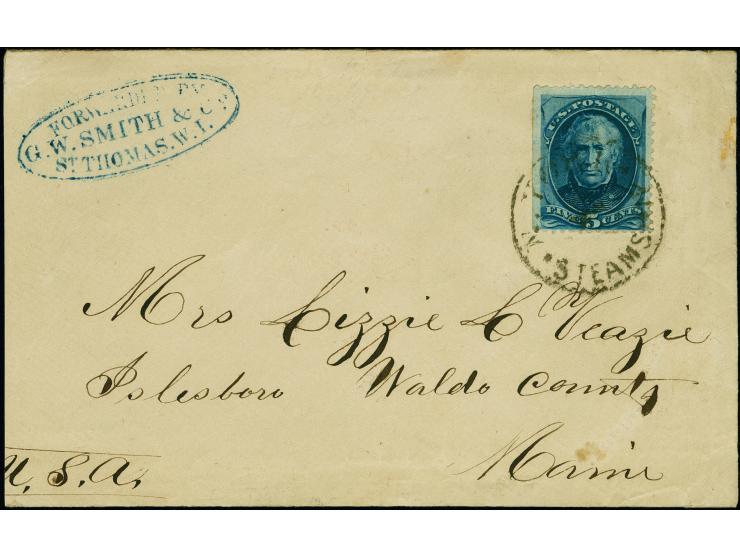 1876 (circa), cover from the Roche Brothers in St. Croix, struck on front with blue oval “Forwarded by / G.W. SMITH & CO / St. Thomas W.I.”, franked with 1875 5c blue in prepayment of the U.P.U. rate to Islesboro, Maine, tied by N.YORK STEAMSHIP c.d.s., cover opened on three sides, slightly reduced at left, yet a scarce usage following the dissolution of the United States & Brazil Mail Steamship Co.