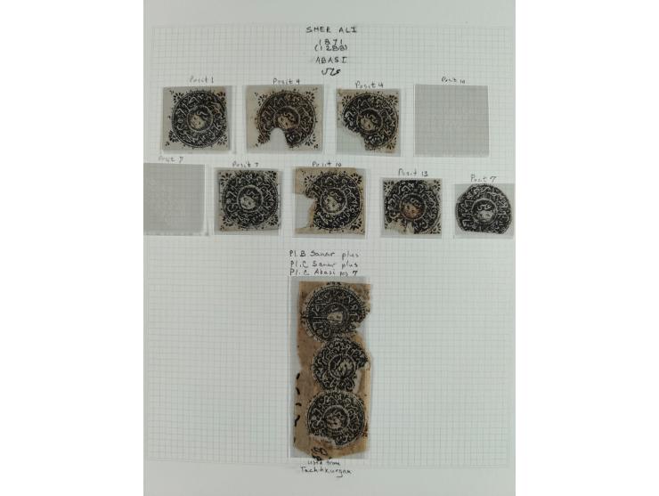 1871, (1288), Sher Ali, Lion Issue, printed “Kingdom of Kabul”, over seventy singles and one cover, being a study of the varieties of the shahi, sanar, and abasi denominations, typically cancelled with corner bite, some further cancelled in manuscript typical of Kabul or red smear cancel of Peshawar, note interesting combination usage of two 1sa (Pl. B and C) and 1ab (Pl. C) on piece cancelled with manuscript markings of Tashkurghan, 1872 cover from Peshawar, condition varies dramatically as typical of these issues, an ideal reference or nucleus for an expanded study. (Scott ex 1-7)