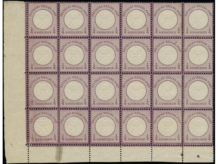 1872, Kleiner Schild ¼ Gr. grauviolett im waagerechten 24er-Block aus der linken unteren Bogenecke, farbfrisch und gut gezähnt, gut geprägt, teils mit Waffelgrund, alle Marken postfrisch. Der Unterrand unten links angetrennt und mit durchschlagendem Falz gestützt, die Zähnung in 2 Reihen gering gestaucht und 2 Werte mit winzigem Stockpunkt, sonst einwandfrei. Ein Wert signiert Ebel, sonst unsigniert und sehr frisch. Größte von Profi registrierte postfrische Einheit dieser Marke und Unikat; aus dem berühmten Burrus-Bogen.