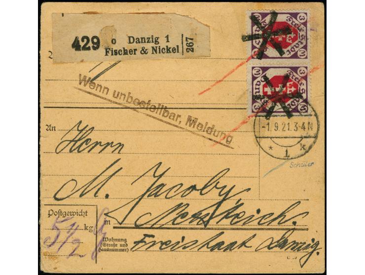 1921, Staatswappen 3 Mark braunviolett/karminrot im waagerechten Paar mit sechsstrahligem Sternen-Korkstempel und Rotstiftstrich-Entwertung als tarifgerechte Mehrfachfrankatur auf Paketkarten-Stammteil mit nebengesetztem Stempel “DANZIG *1k 1.9.21” und Selbstbucher-Paketzettel der Fa. Fischer & Nickel nach Neuteich mit Ankunftsstempel, leichte Randspuren, in guter Erhaltung