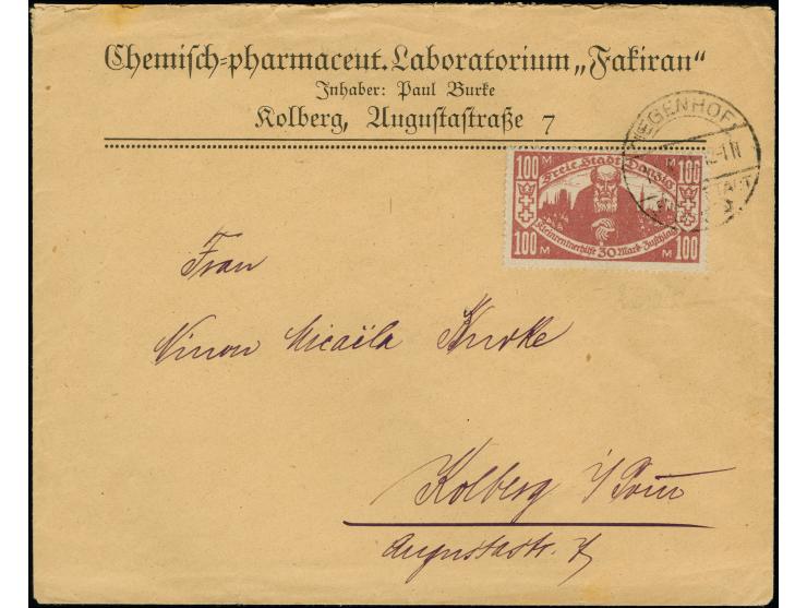 1923, Kleinrentnerhilfe 100 Mark mit Stempel “TIEGENHOF (FREIE STADT DANZIG) 13.4.23” als tarifgerechte Einzelfrankatur auf Firmen-Vordruckbrief nach Kolberg, in einwandfreier Erhaltung, eine nicht häufige Einzelfrankatur, signiert Infla Berlin