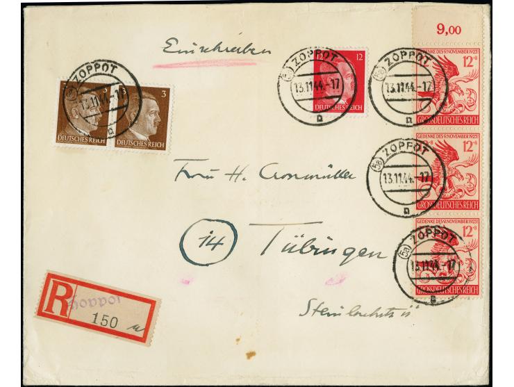 “(5a) ZOPPOT n 13.11.44” mehrfach klar auf Deutsches Reich Hitler 3 Pfennig im waagerechten Paar und Einzelwert 12 Pfennig sowie senkrechter Dreierstreifen 21.Jahrestag des Marsches zur Feldherrenhalle 12 Pfennig als tarifgerechte Frankatur auf R-Brief der 2. Gewichtsstufe nach Tübingen mit Ankunftsstempel. Der Umschlag mit senkrechter Faltung und kleine Randspuren, sonst in guter guter Erhaltung, recht seltener Stempel mit PLZ