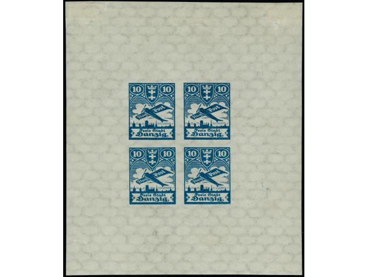 1924, Flugpost 10 Pfg. grünlichblau, Probedruck, ungezähnter Viererblock als Kleinbogen (92x104mm) auf Papier mit liegendem Wasserzeichen,die Marken postfrisch, im Rand Falz, tadellos, sign. Ruberg
