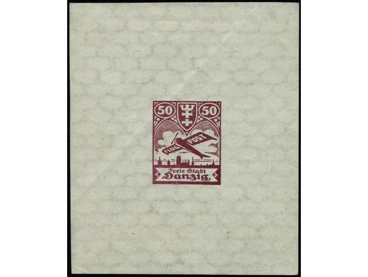 1924, Flugpost, 50 Pfg. rotlila, nicht verausgabte Wertstufe, als Einzelabzug im Blockformat (61x72mm) auf Papier mit liegendem Wasserzeichen, die Marke postfrisch, Falz im Oberrand, schräger Bug, sonst tadellos, selten, sign. Hochkeppeler