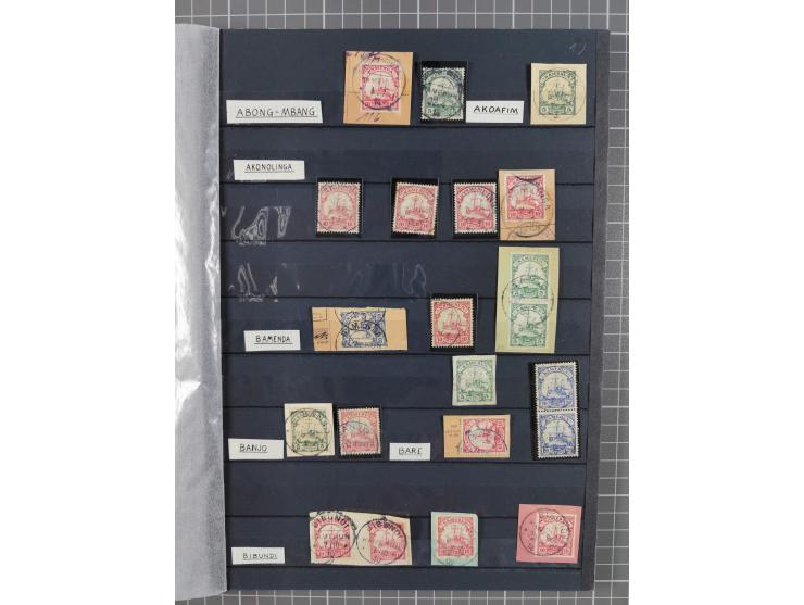 1900/14 (ca.), Abong-Mbang bis Victoria, umfangreiche Stempel-Sammlung auf losen Marken und vielen schönen Briefstücken mit über 180 Werten, dabei bessere Stempeln mit u.a. “BIBUNDI”, “NGAUNDERE”, sowie Bahnmpostempel mit “BONABERI-NKONGSAMBA BAHNPOST”, “DEUTSCHE SEEPOST LINIE HAMBURG WEST AFRIKA”, etc., viele klare Abstempelungen und meist in guter Gesamterhaltung