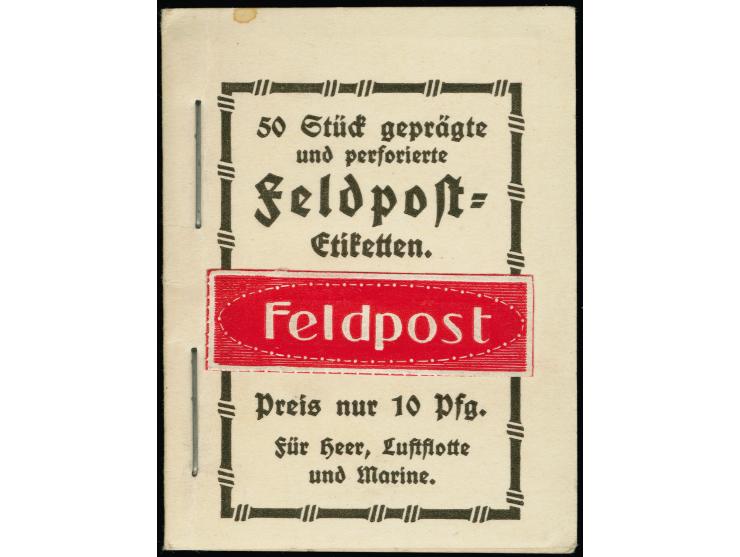 1914, Feldpost-Heftchen “50 Stück geprägte und perforierte Feldpost-Etiketten” mit rot/weißen Aufklebe-Zetteln “Feldpost”, kpl., erster Zettel auf dem Deckel aufgeklebt und zum Teil angetrennt, sonst in guter Erhaltung