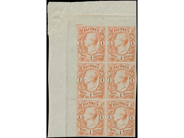 1 Ngr., Probedruck in zinnoberrot, 6er-Block aus der linken oberen Bogenecke, mit breiten Bogenrändern, ungummiert. Eine seltene Einheit.