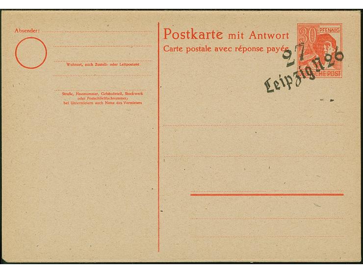 “27/Leipzig N 26” (Arge 27/L18), auf Doppel-Karte Arbeiter 30 Pfg., sogen. amtlicher Nachdruck für das Postmuseum, ungebraucht und tadellos. Es sind nur sehr wenige Stücke bekannt, eine große Seltenheit. Unsigniert mit Fotoattest Kalb BPP (2022)