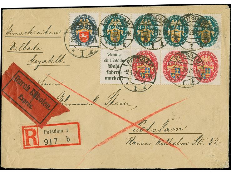 1928, Nothilfe-Heftchenblatt in MiF mit Mi. 428 auf R-Eilboten-Ortsbrief in Potsdam vom 9.4.29, die Frankatur ist echt und einwandfrei, der Umschlag weist Gebrauchsspuren auf, Fotoattest Schlegel BPP (2011)