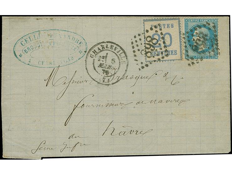 20 C. grauultramarine, Spitzen nach oben, in Doppelfrankatur mit Napoleon 20 C. blau, alle Marken entwertet durch französischen GC “898” mit nebengesetztem DKr. “CHARLEVILLE 5 MARS 71” auf Faltbrief nach Le Havre mit rückseitigem Ankunftsstempel, die französische Marke und der Beleg mit leichter senkrechter Faltung, sonst in guter Erhaltung. Eine seltene und attraktive Frankatur- und Stempel-Kombination