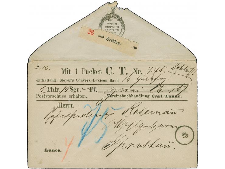 Norddeutsche Packet-Beförderungs-Gesellschaft: 1869, gedruckter Postvorschuss-Paketbegleitumschlag der Breslauer Firma Karl Tanne (mit zugehörigem Begleitzettel datiert Dezember 1868), mit dem für die private Beförderungsgesellschaft typischen Datumsstempel "2/5" und rückseitigem Paketzettel, nach Sprottau. Vorderseitig in blau notierter Vorschuss-Betrag von "75" Gr. sowie roter Portovermerk "4" Gr. Einziger in dieser Form registrierter Beleg. Dazu Empfangsschein der Gesellschaft für ein anderes Paket sowie 85-seitige Abhandlung über die Gesellschaft.