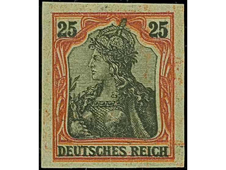 1902, Andruckprobe 25 Pfg. ungezähnt mit Doppeldruck auf grünlichem, satiniertem Papier ohne Gummierung, in einwandfreier Erhaltung. Der dekorative Probedruck ist unsigniert mit Fotoattest Oechsner BPP (1999)