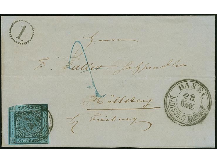 "170" sauber auf 3 Kr. auf blau, oben links schräg angeschnitten, sonst voll- bis breitrandig, mit nebengesetztem DKr. "BASEL BADISCH. BAHNHOF. 28 NOV." (1860) sowie Uhrradstempel 1 (Leopoldshöhe) auf kleiner Briefhülle nach Höllstein bei Freiburg. Ein attraktiver und seltener Brief; PROFI hat nur 3 weitere der geschnittenen Ausgabe mit diesem Stempel registriert. Fotoattest Stegmüller BPP (2025)